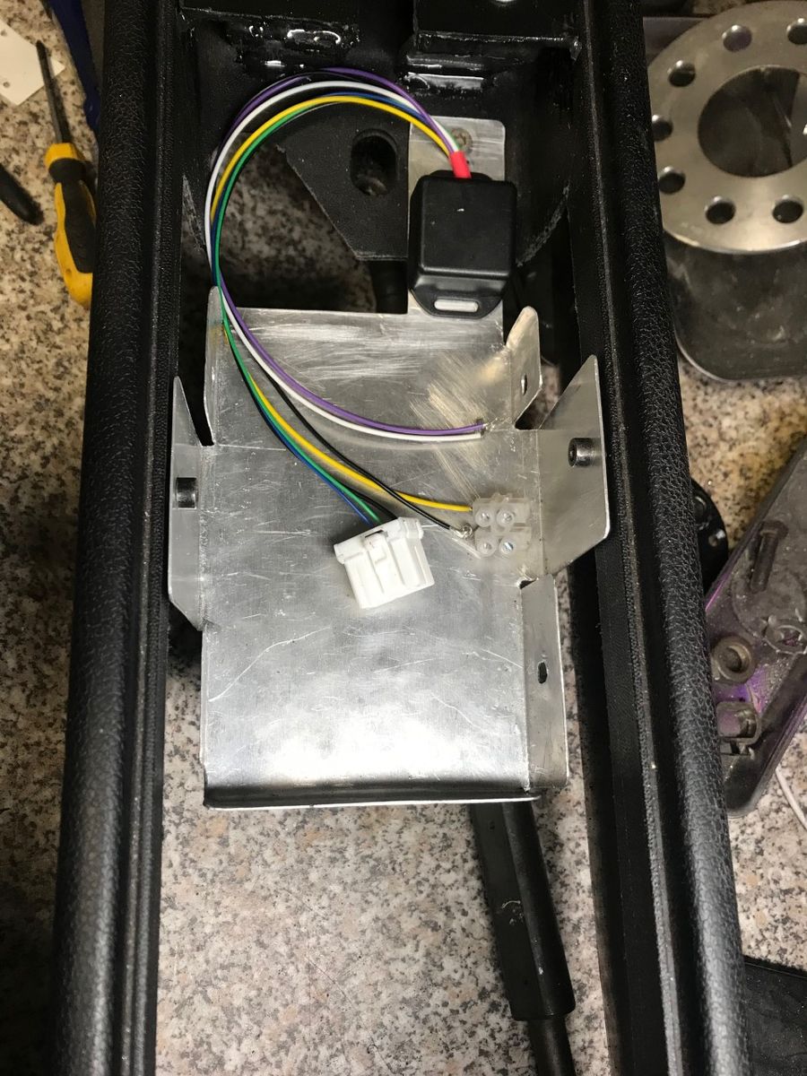 Die ganzen Komponenten für die E-servo haben ihren Platz gefunden. An den Steuergeräthalter was ich gebaut habe kam auch das Zusatzmodul drauf. Dieser ermöglicht mir dann mit Hilfe eines Potis die Lenkunterstützung beliebig einzustellen.