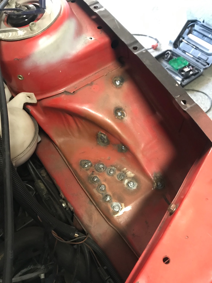 Vorne rechts an der Kotflügelbefestigung waren Rostlöcher. Diese habe ich durch neue Bleche ersetz. Aber leider zu wenig Bilder gemacht.