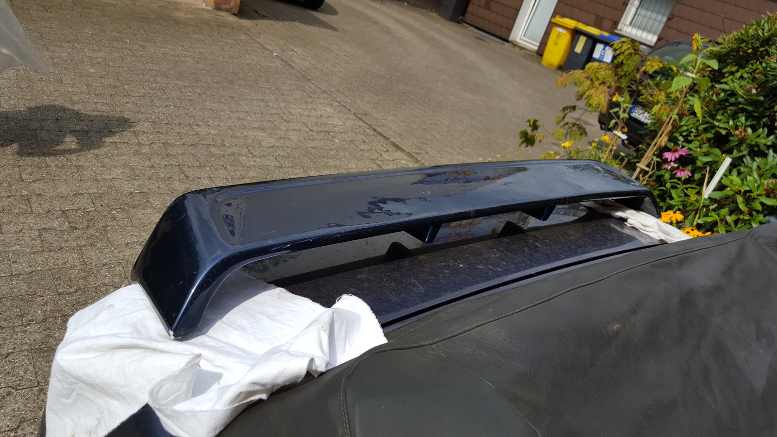 hab seit einigen jahren einen heckspoiler rumliegen, der mir mal verkauft wurde. leider hab ich keine papiere dazu und auch keinen schimmer von wem das teil kommt. er hat 2 mittelstege, die form aussen legt sich schön an den heckdeckel an. qualitativ ist das ganze gut verarbeitet, er wirkt nicht laberig, vernünftige gewindeeinsätze sind im material. das ganze ist aus gfk gefertigt.