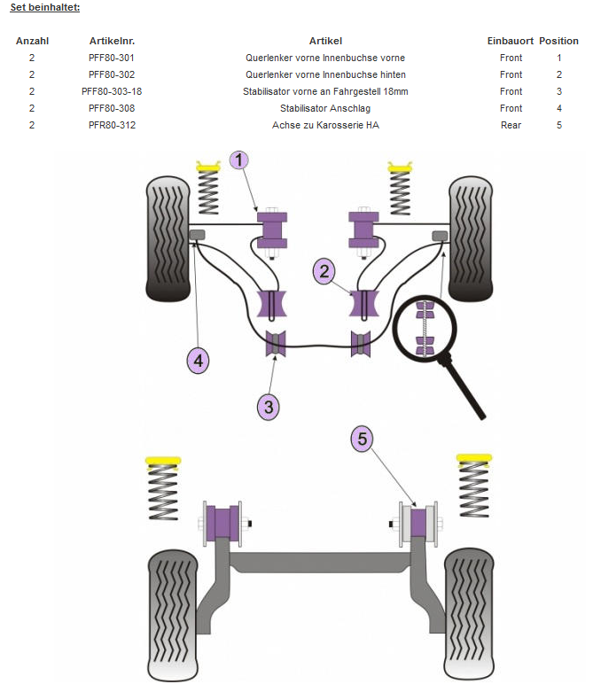 Für die Querlenker vorn sind PU-Buchsen schon empfehlenswert, aber nicht ratsam. Grund ist, weil sich die "normale" Hülse in den Buchsen in die Querlenkeraufnahmen einarbeitet. Ich habe meine PU-Buchsen deswegen umgearbeitet und mit der originalen Hülse aus normalen Buchsen ausgestattet.