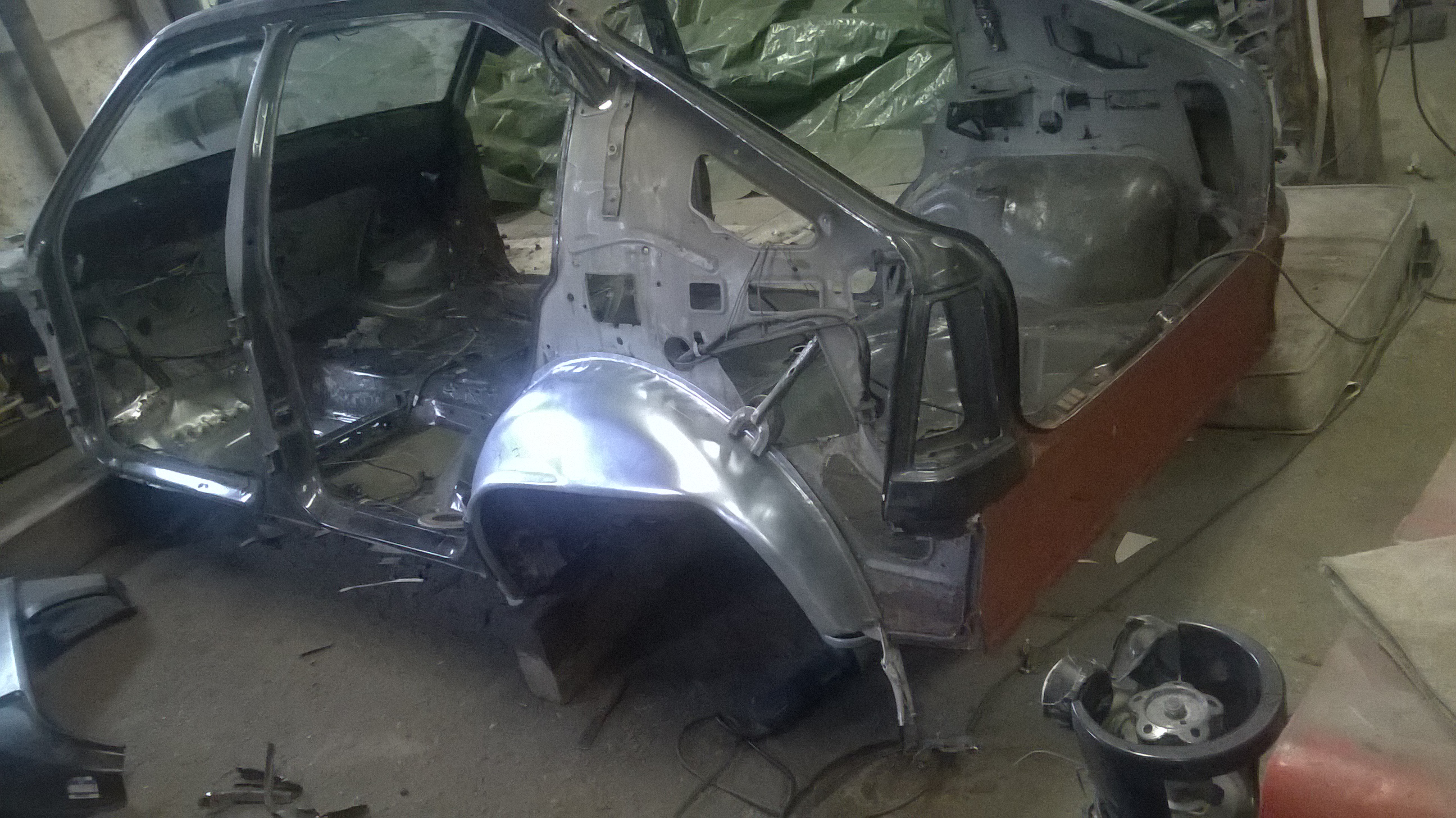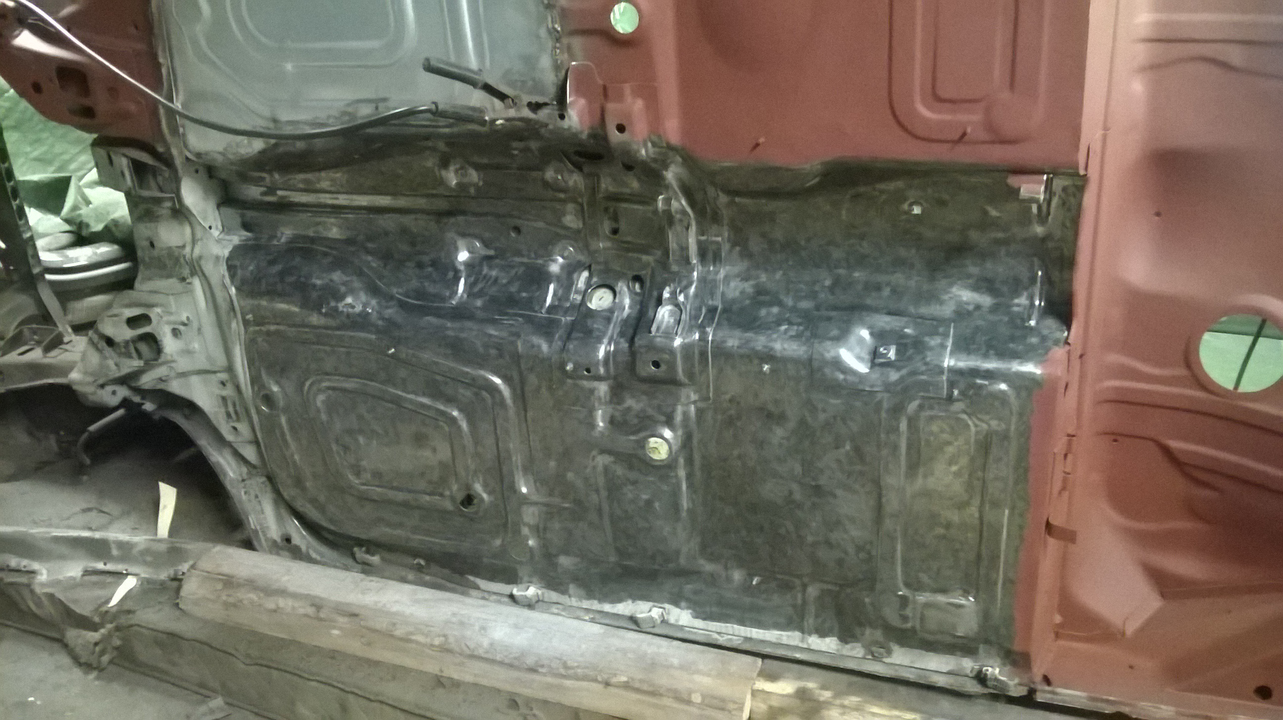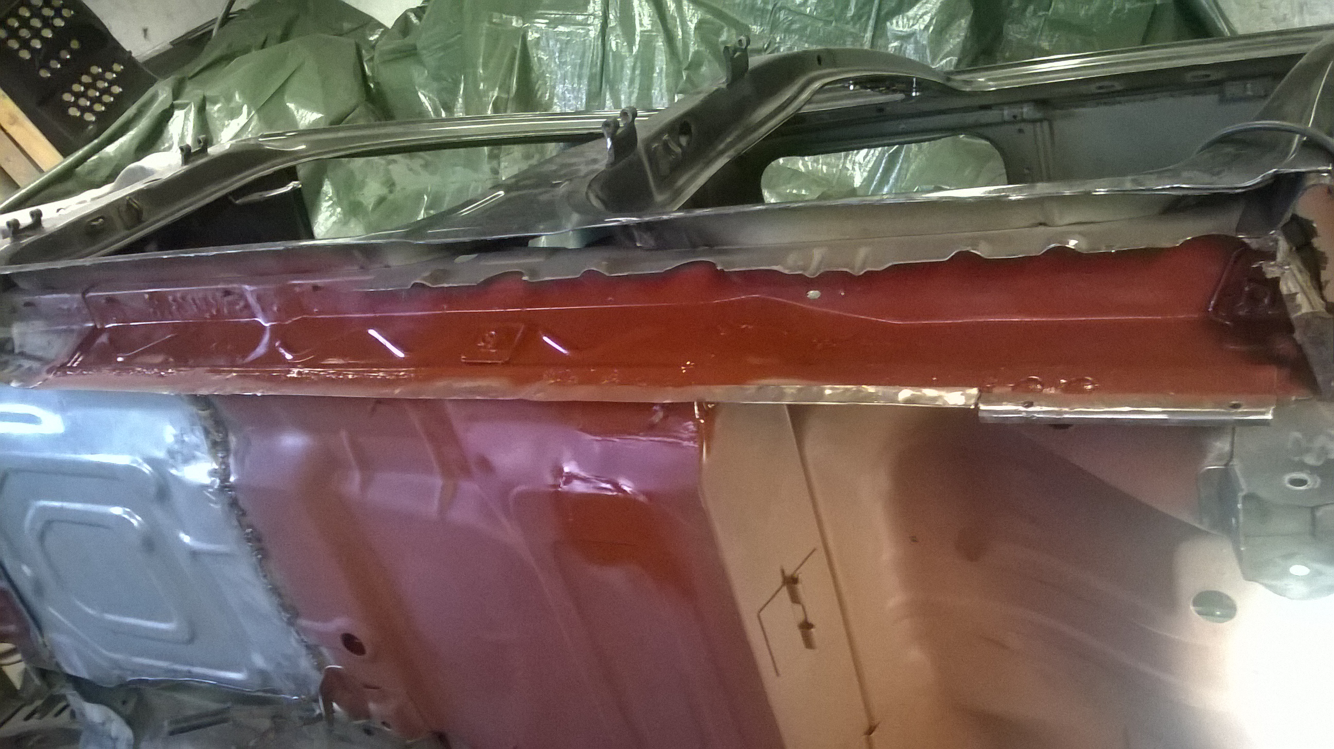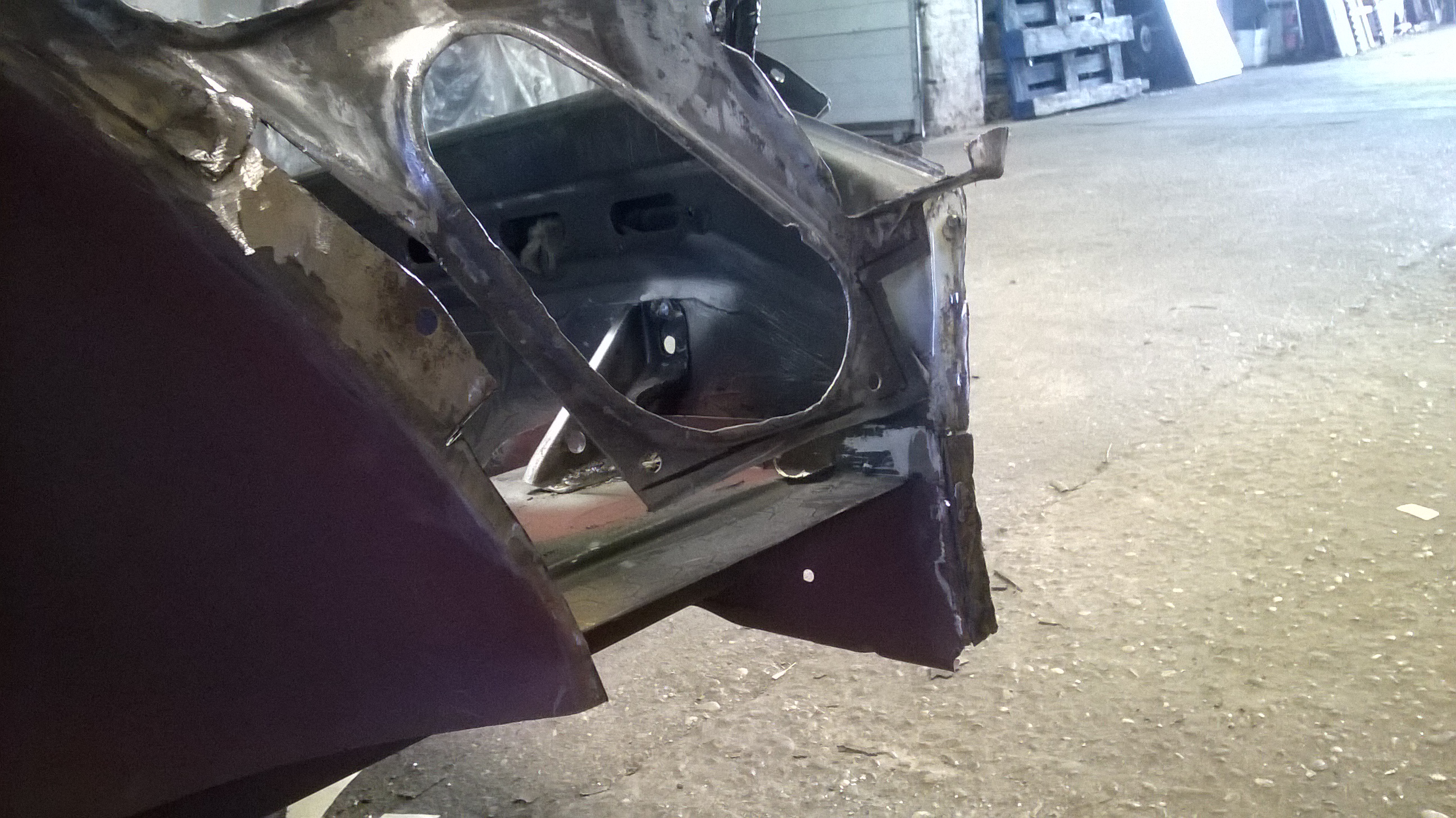 Löcher am Boden wurden weiter verschweißt, Boden blank geschliffen und teils neu grundiert und die Seitenwand ausgebohrt und der Schweller und Innenradkasten probehalber angepaßt.Morgen nochmal durchstarten und dann ist erst mal Pause für 1-2 Wochen.......