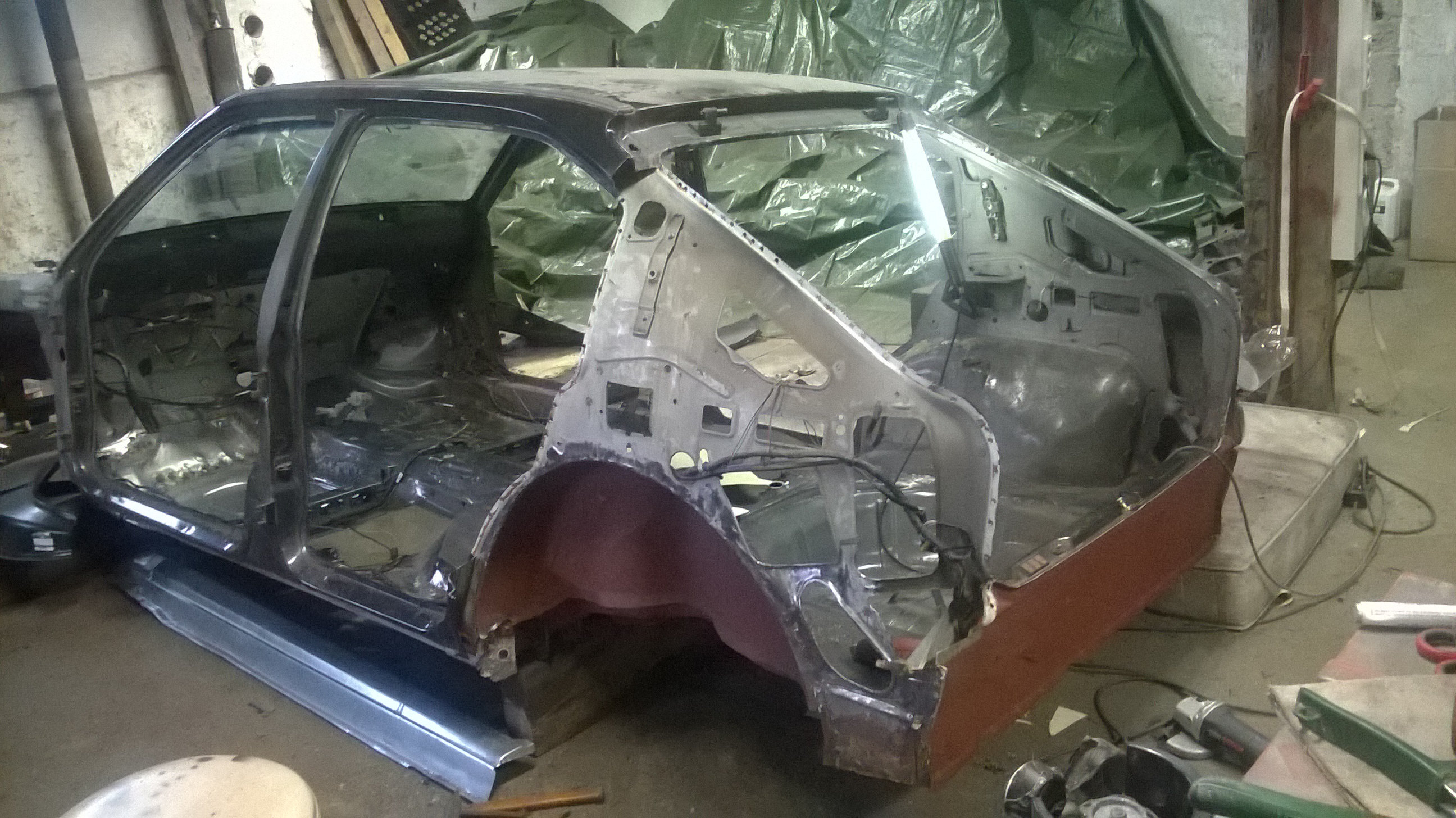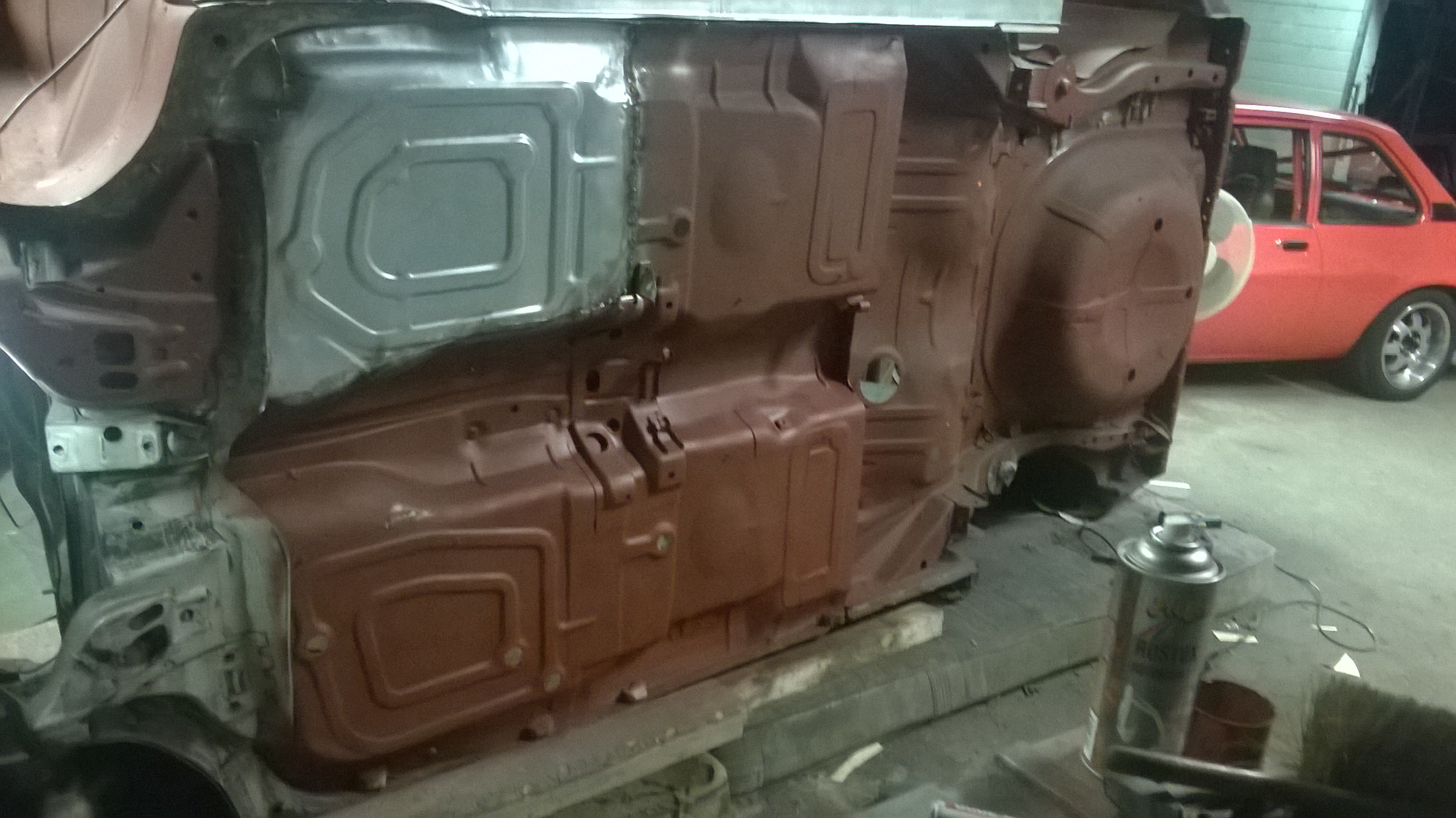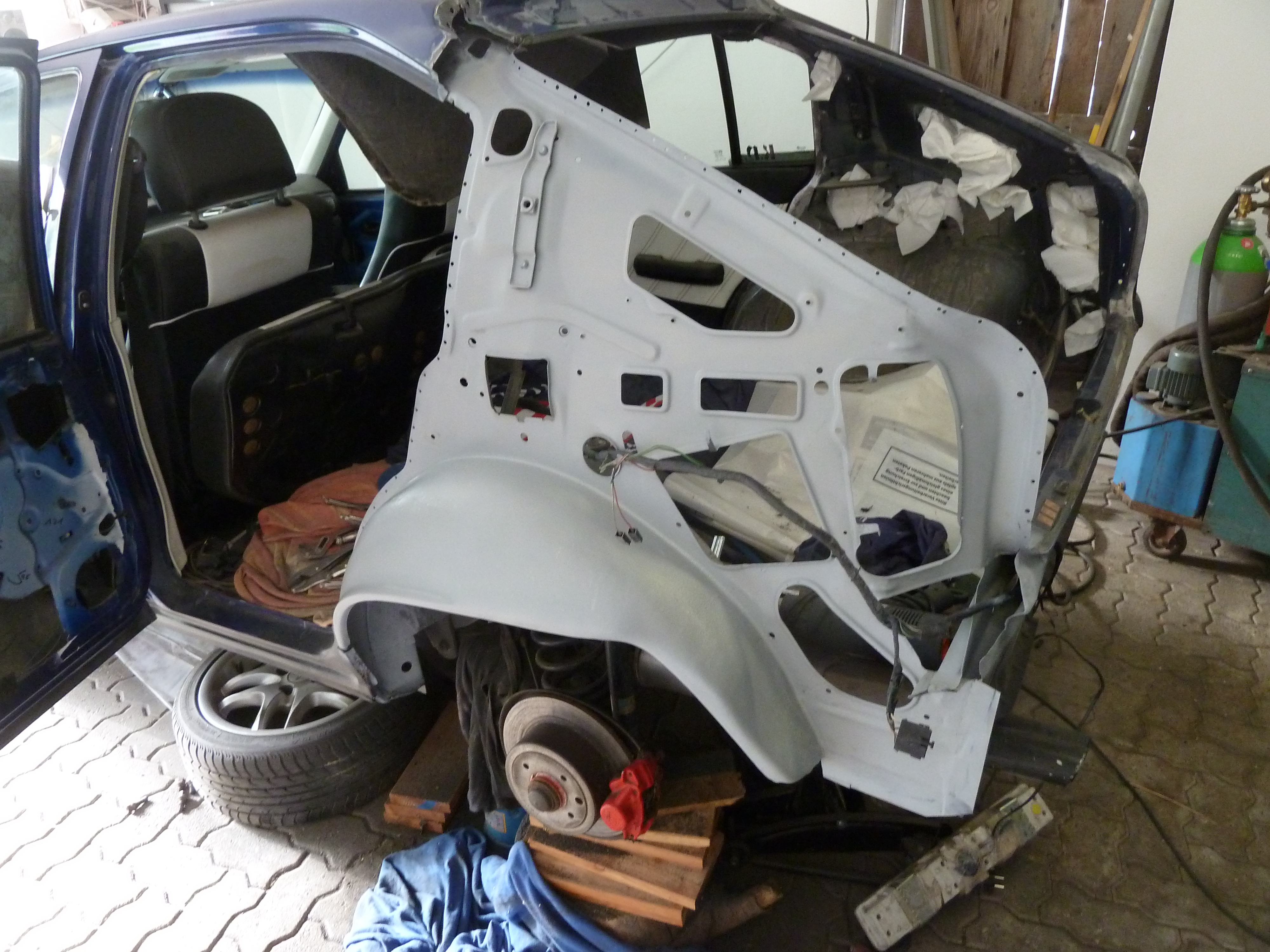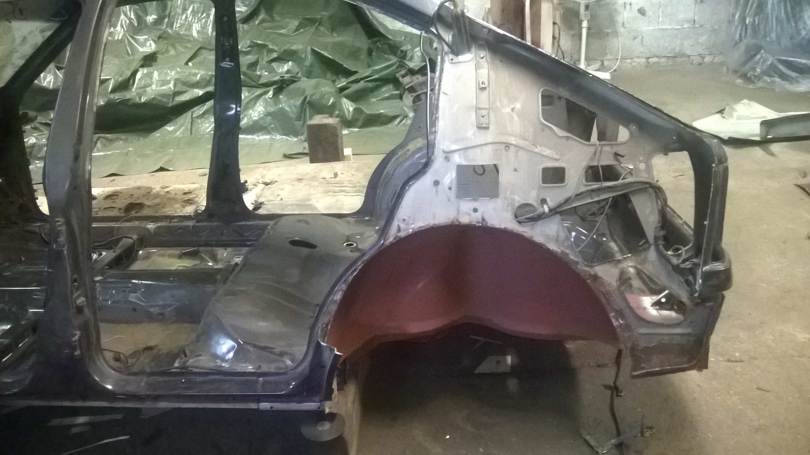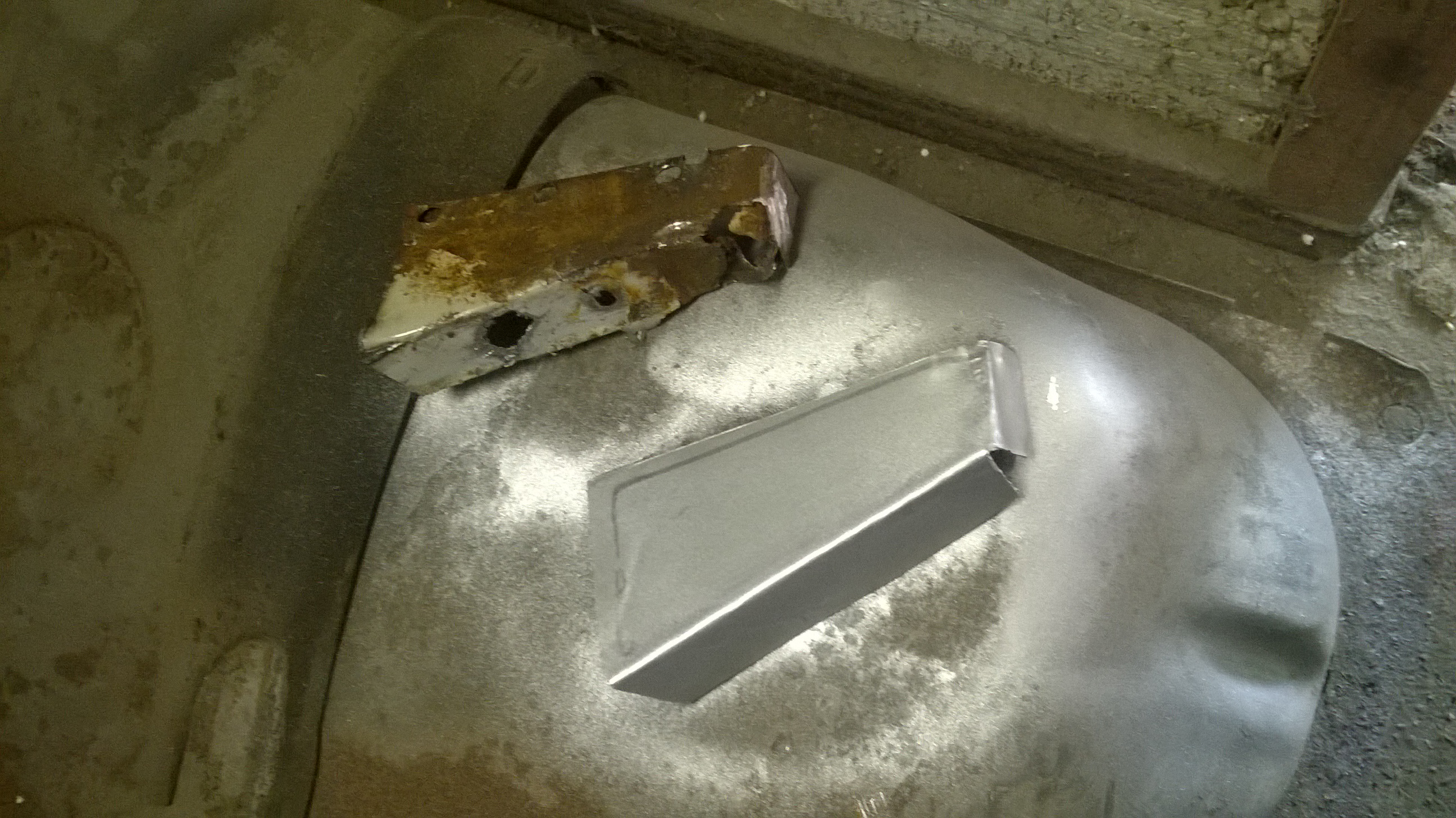 Löcher am Boden wurden weiter verschweißt, Boden blank geschliffen und teils neu grundiert und die Seitenwand ausgebohrt und der Schweller und Innenradkasten probehalber angepaßt.Morgen nochmal durchstarten und dann ist erst mal Pause für 1-2 Wochen.......