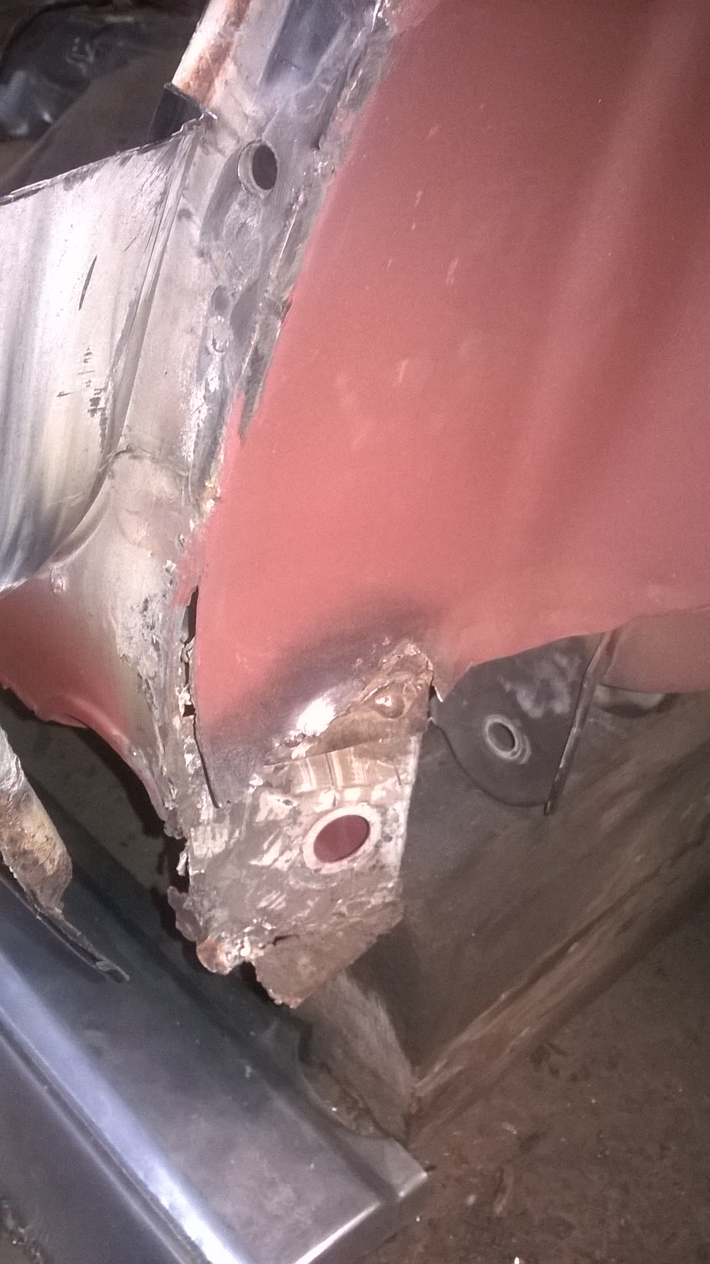 Heute kam nach dem herausbohren der Seitenwand folgendes zum Vorschein (was immer die da machen wollten, warum an dieser Stelle unter der Befestigung vom Türbolzen hinten ??? )