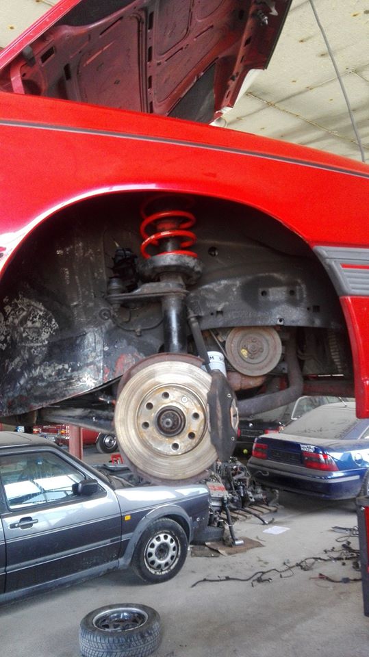Für den TÜV fehlen nach einer ersten flüchtigen Inspektion die hinteren Dämpfer, Querlenkeraufnahme schweißen (Rep. Blech liegt im Kofferraum) und wieder zusammenbasteln.