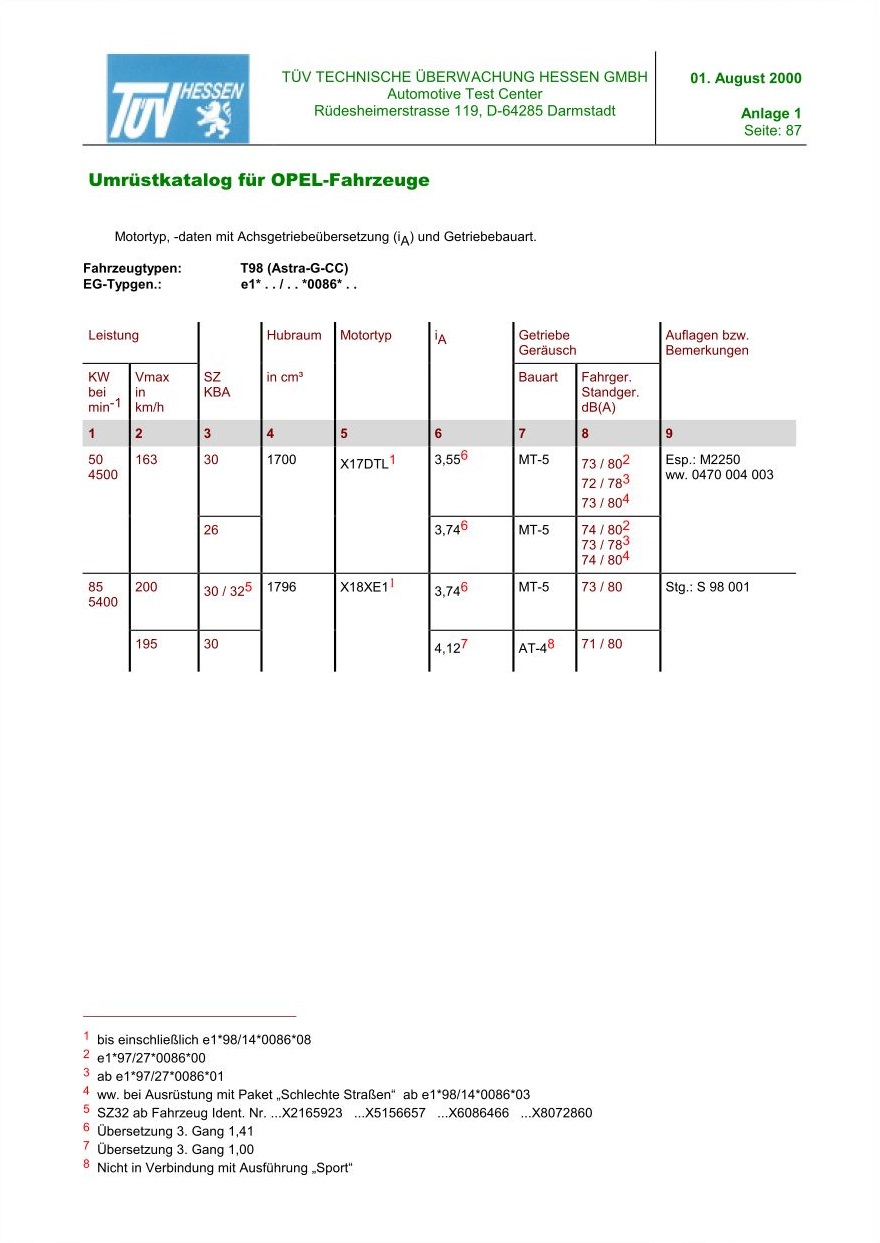 Bei meinem Cabrio heißt das noch "mit Nachtrag", in meinem Fall E388/1 Nachtrag 4.Mal als Beispiel den Astra G CC, der hat die ABE e1*98/14*0086, die Fassung geht von 01 bis 23. Jetzt hast du ein Auto, das nach e1*98/14*0086*08 zugelassen ist. Verbaut ist ein Z22SE. Die passende Seite habe ich angehängt, siehe auf dieser Seite die Fußnote 2: "ab e1*98/14*0086*08". Im selben Umrüstkatalog steht auch der Motor X18XE1 mit Fußnote 1: "bis einschließlich e1*98/14*0086*08". Damit darfst du einen Z gegen einen X Motor tauschen.