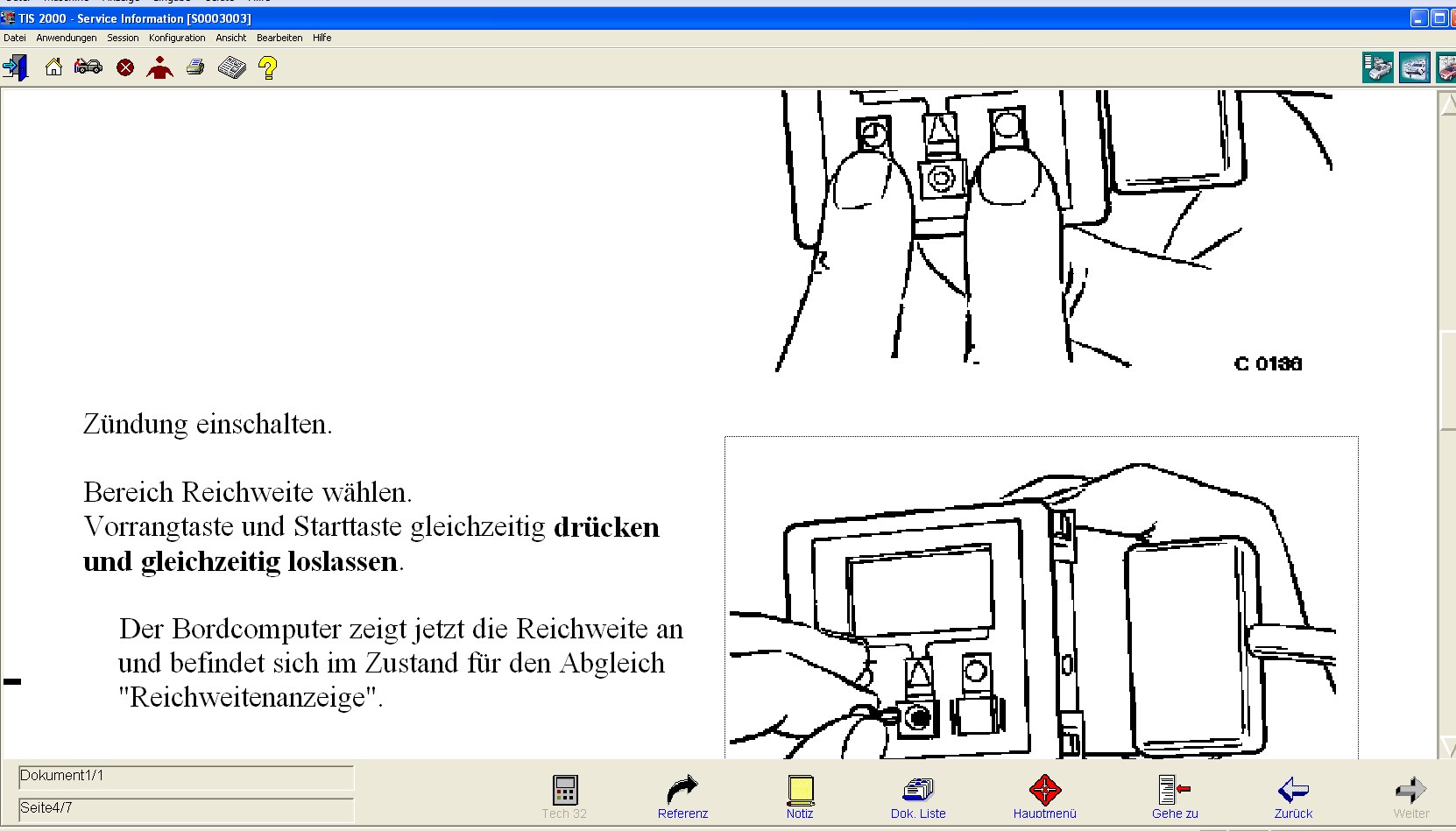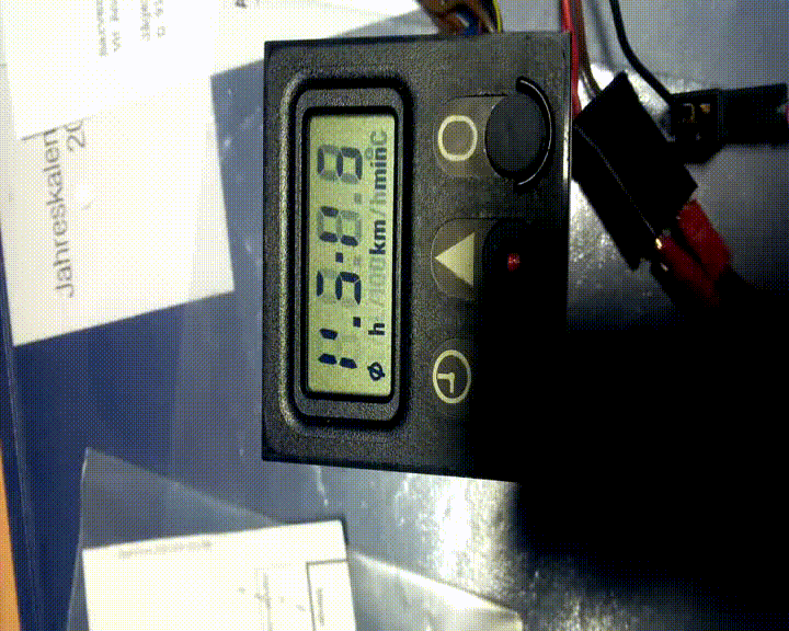 Ich besitze dieses Prüfgerät mit dem Abgleichadaptern, es geht aber auch so, wenn man vollgetankt hat, die Reichweite per Tastendruck aktualisiert, dann läuft die ja hoch, wenn man dann am Trimmer hinter der mittleren Taste dreht, stellt man diesen auf den gewünchten Sollwert ein, das klappt ganz gut und ist eigentlich hinreichend genau. Wichtig: der Impulsgeber am Getriebe muss dazu passen, sonst stimmt die Geschwindigeit und damit die Reichweite nicht. Einen Zweitasten Drückmodus gibt es dort nicht, immer nur eine Taste drücken. Weitergeschaltet wird immer mit der mittleren Taste, Temperatur, Momentangeschwindigkeit, Durchschnittsgeschwindigkeit, Reichweite, Stoppuhr. Es gibt häufig das Problem, daß die Gummitastatur nicht mehr leitfähig genug ist, um den Tastendruck erkennen zu lassen. In diesem Fall könnte man höchstens einen SMD Widerstand in Reihe zu den beiden Zuleitungen setzen und die Gummitaste mit Alufolie überkleben. Habe auch das Problem bei einem Bordcomputer.