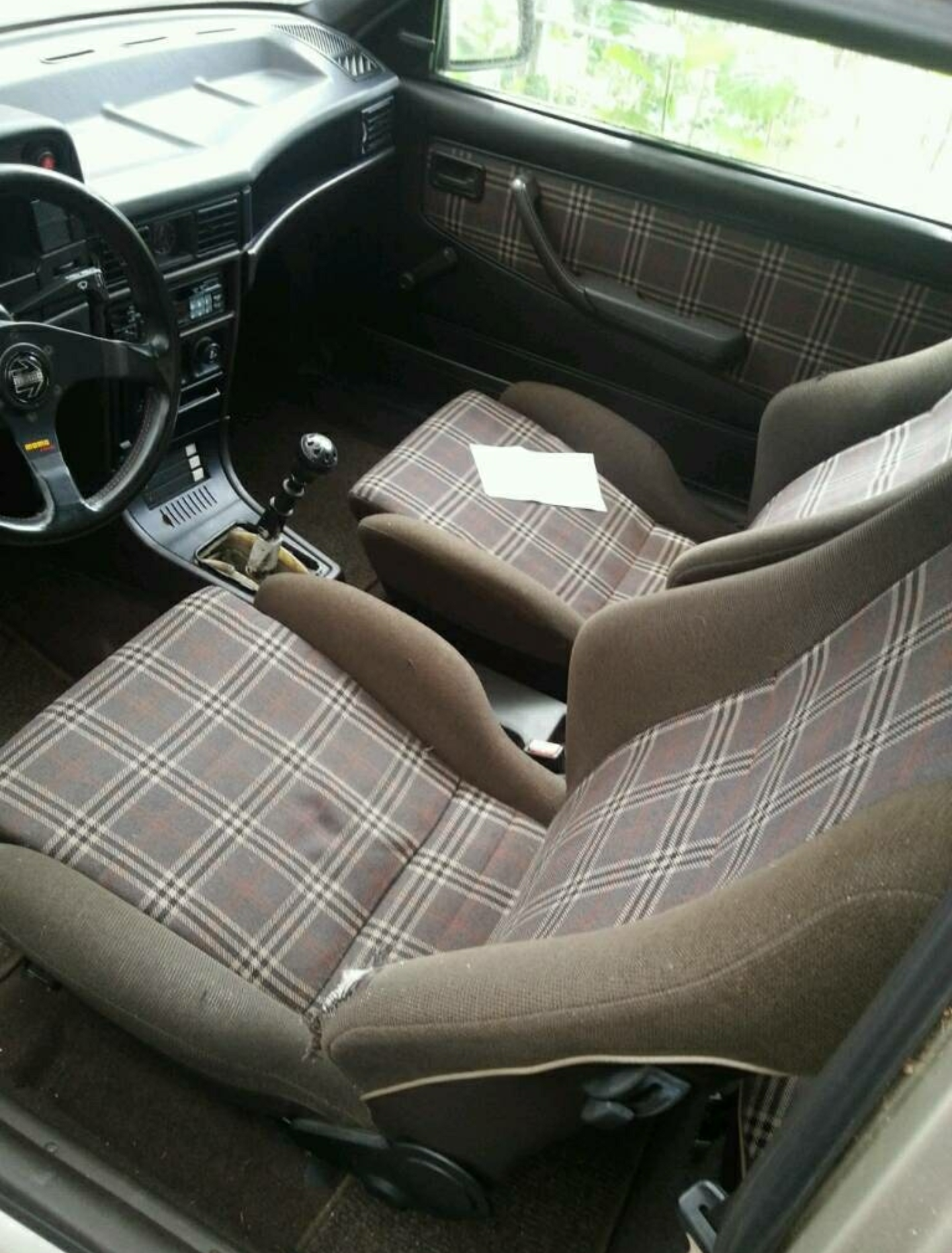 Wo die Ausstattung genau herstammt kann ich nicht sagen, ich vermute aber dass sie aus einem 87er/88er Sondermodell stammt. Ganz genau könnten wir es herausfinden, wenn an der Unterseite der Sitze noch das Papierschild mit den Ausstattungscodes- und bezeichnungen vorhanden ist.