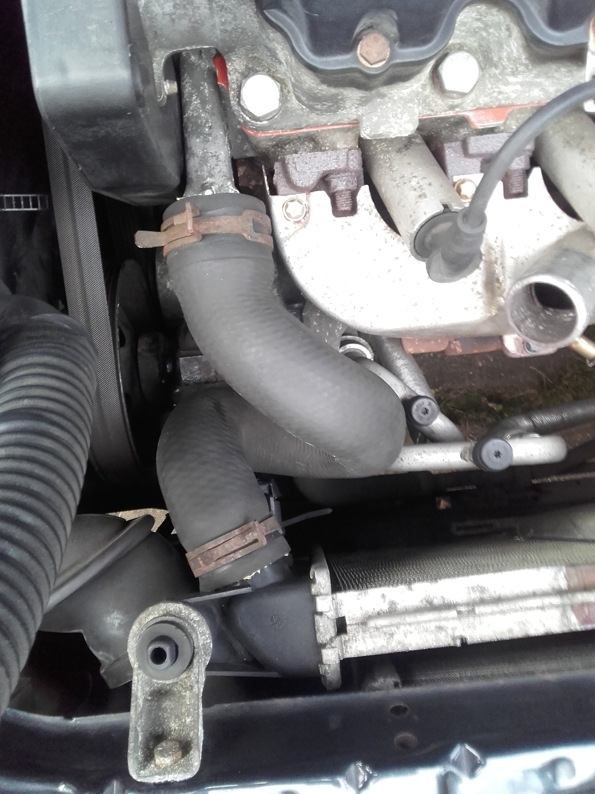 Jetzt stellt sich mir die Frage, wie ich den Kühler ans Thermostatgehäuse anschließen kann. Der Originalschlauch vom C16NZ passt nicht, weil der Kühler ja schmäler ist. Den Schlauch vom C20NE habe ich, aber der passt auch nicht, weil da das Thermostatgehäuse anders ist.