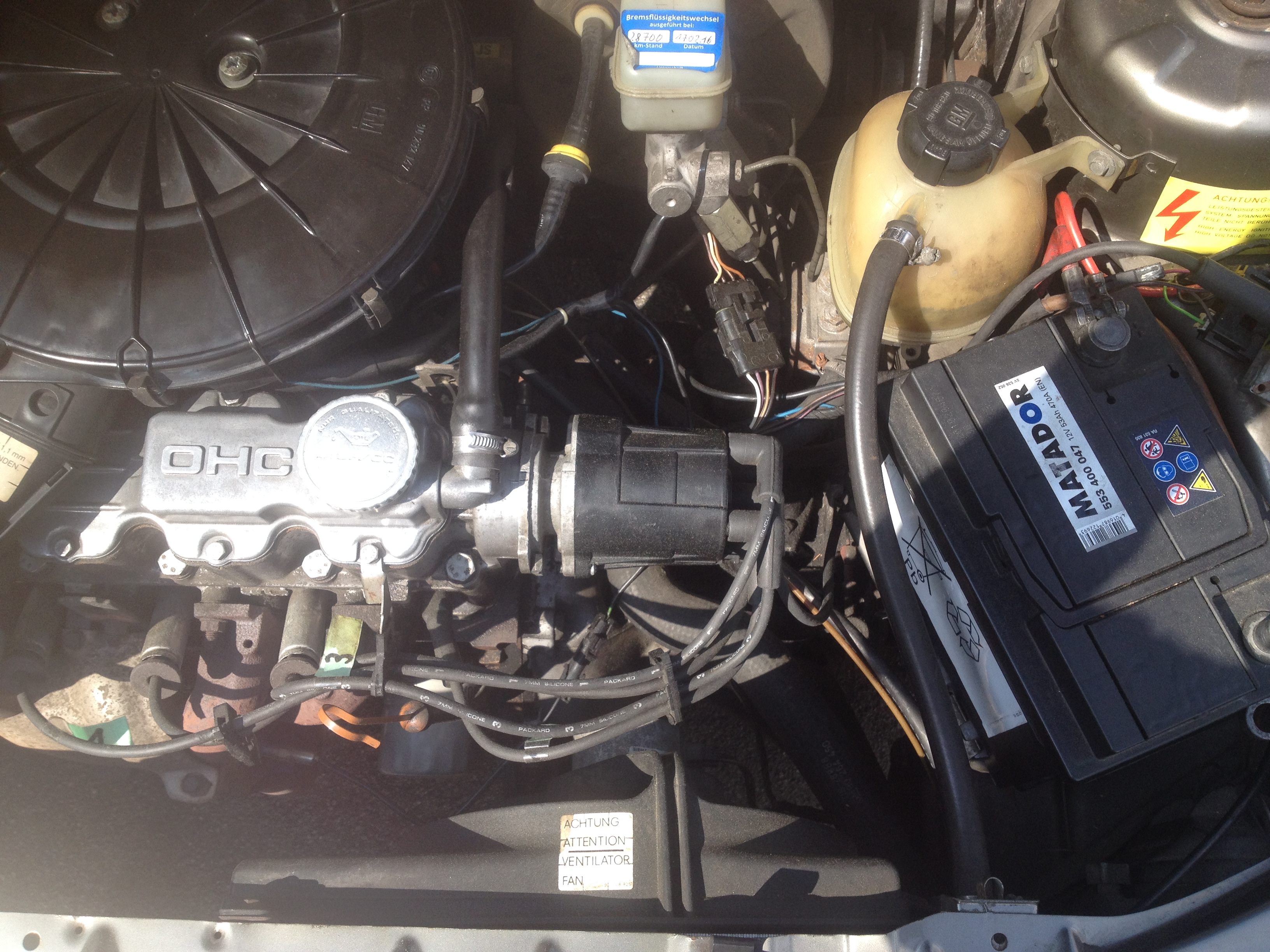 So hier sind ein paar Fotos vom Motor selbst. Einen runden Stecker habe ich im Motorraum nicht. Die Montageschrauben der Zündspule sind o.k.-ich hatte sie ja mal zum testen ausgetascht. Ebenfalls der breite Anschluschstecker mit Klemme 1 und 15. ist o.k., keine Roststelle.Eine ersatz Zündspule wurde bereits mal eingesetzt. Ohne erfolg.