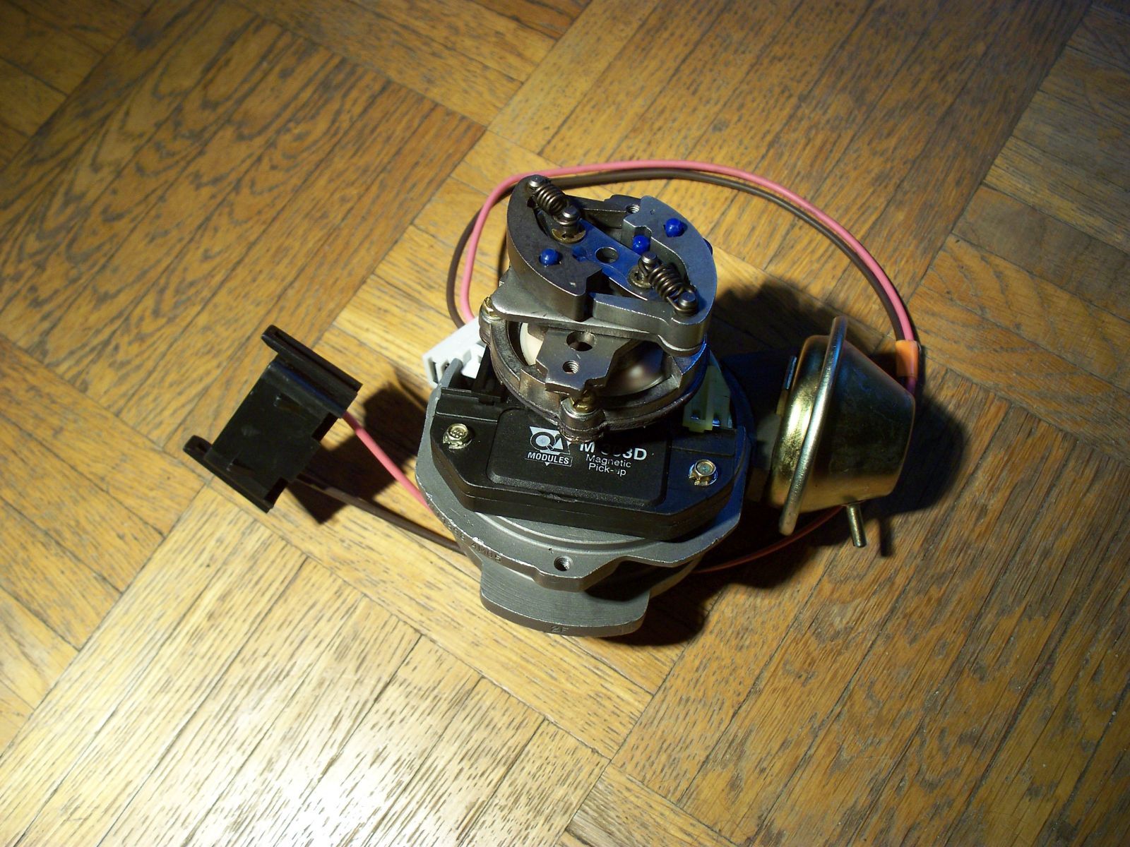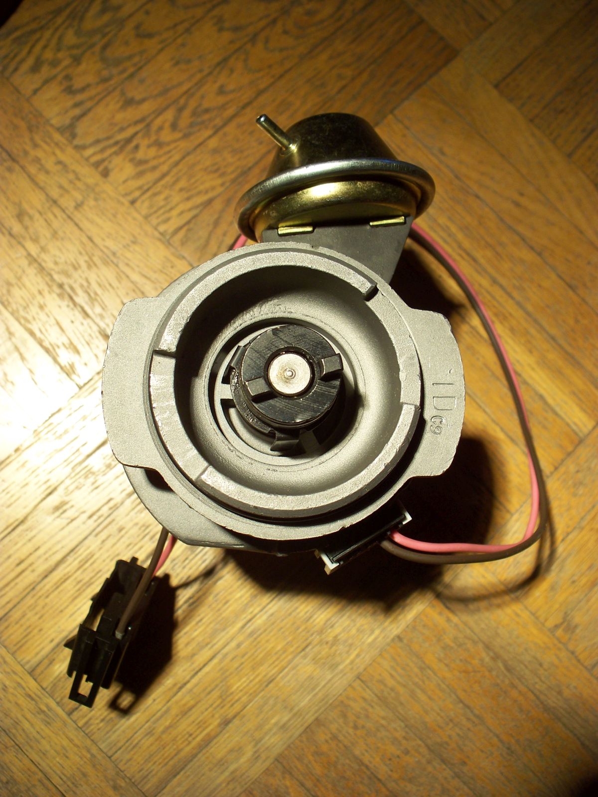 Beim elektronischen Zündverteiler von DELCO liegt die Fliehkraftverstellung gut zugänglich unterhalb des Verteilerläufers. Dieser Verteiler hat neben den Anschlüssen der Zündkabel an der Verteilerkappe natürlich zwei Kabel zur Zündspule statt nur eines bei Verteilern mit mechanischem Unterbrecherkontakt, die ich bei den OHC-Motoren bisher nur von Bosch kenne.