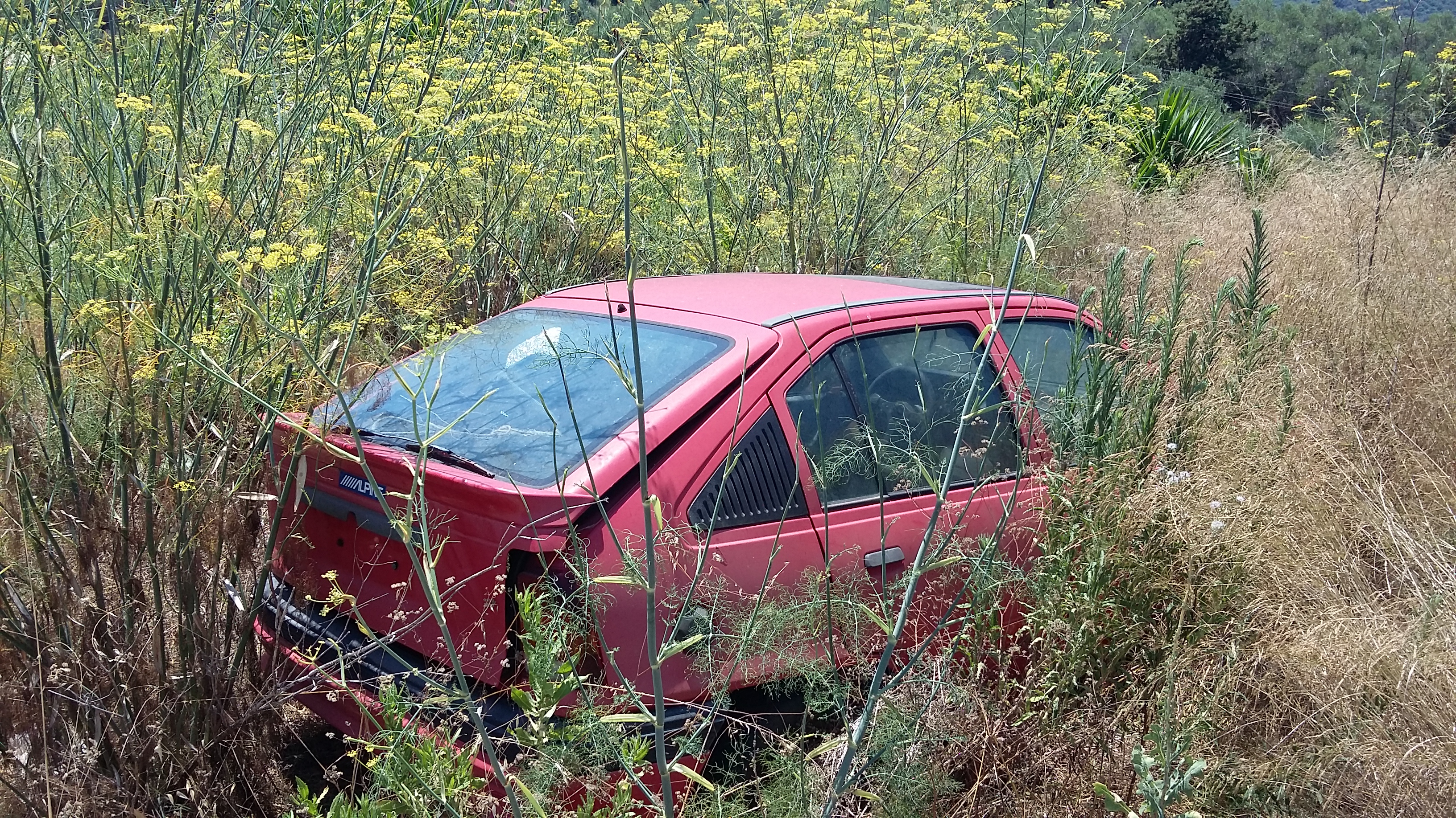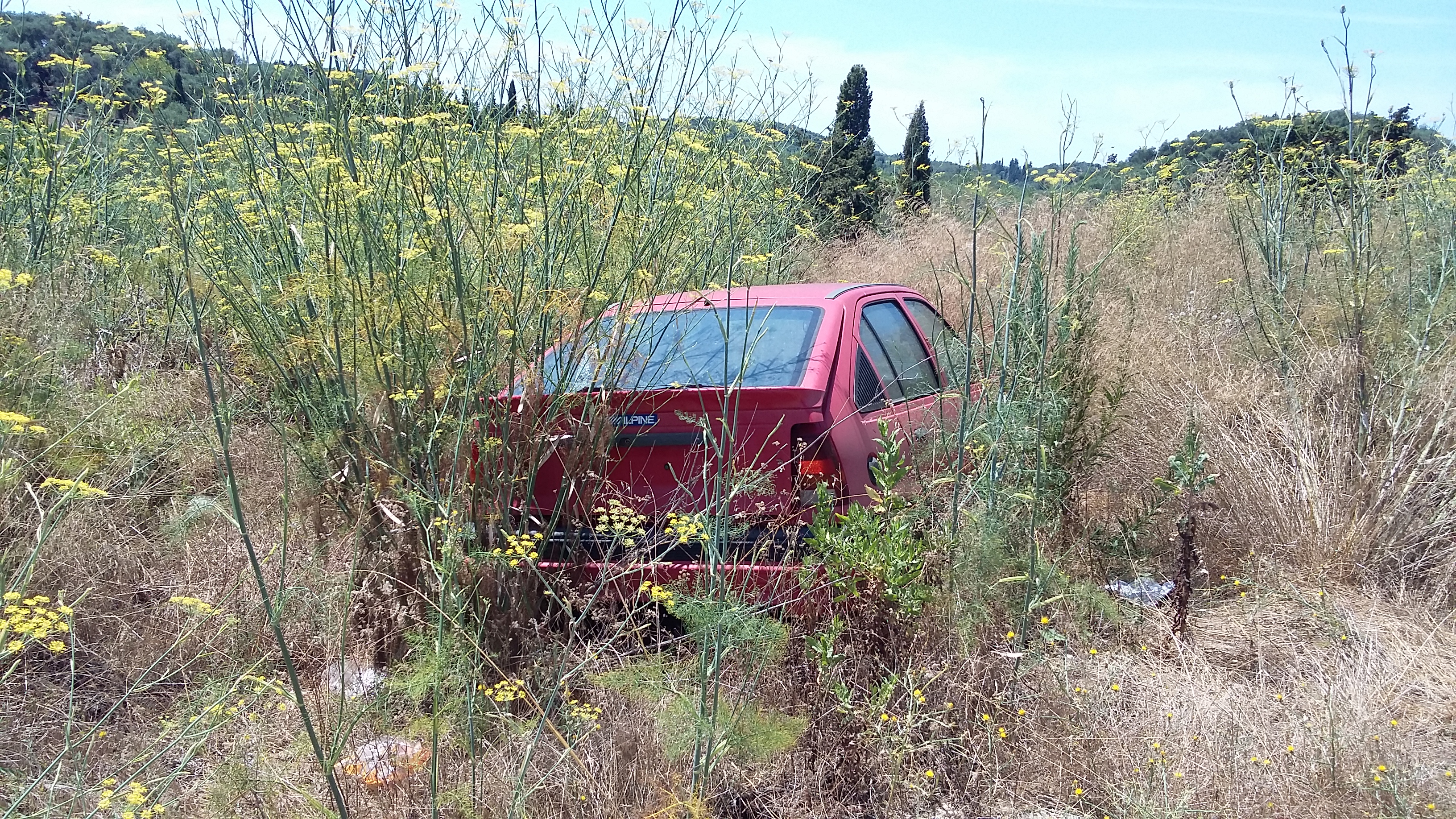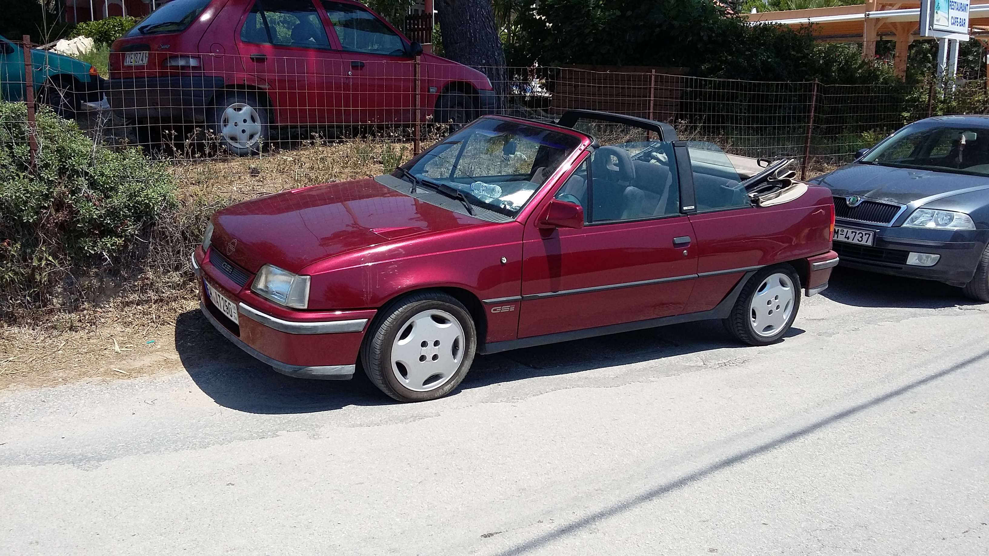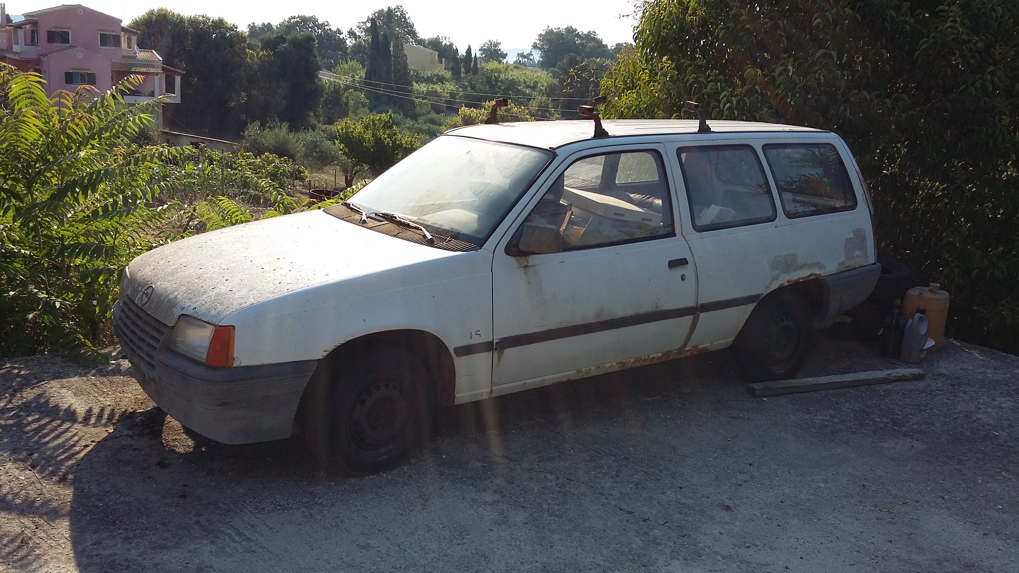 Bin hier gestern in dem kleinen verschlafenem Örtchen Vitalades abseits der Straße über den folgenden vergessenen Kadett Sprint gestolpert. Steht dort wohl schon länger im Freien, der Lack ist matt, eine hintere Seitenscheibe gesprungen, aber blechmäßig vom äußeren Erscheinungsbild noch sehr passabel... -