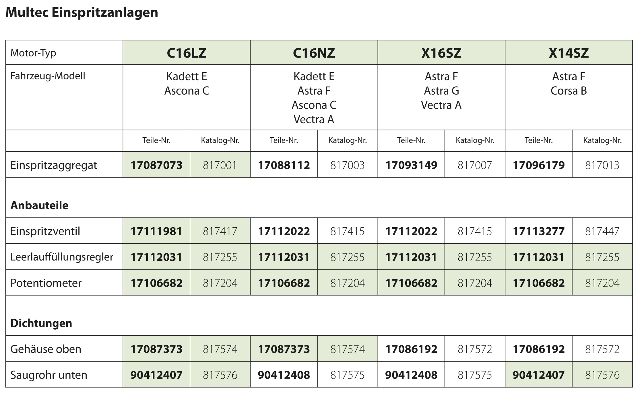 ich habe mich auch schon vor einiger Zeit nach passenden Anbauteilen für meine Multec für den C16LZ interessiert und mir aus dem Teilekatalog die einzelnen Teilenummern in einer Tabelle gelistetet.