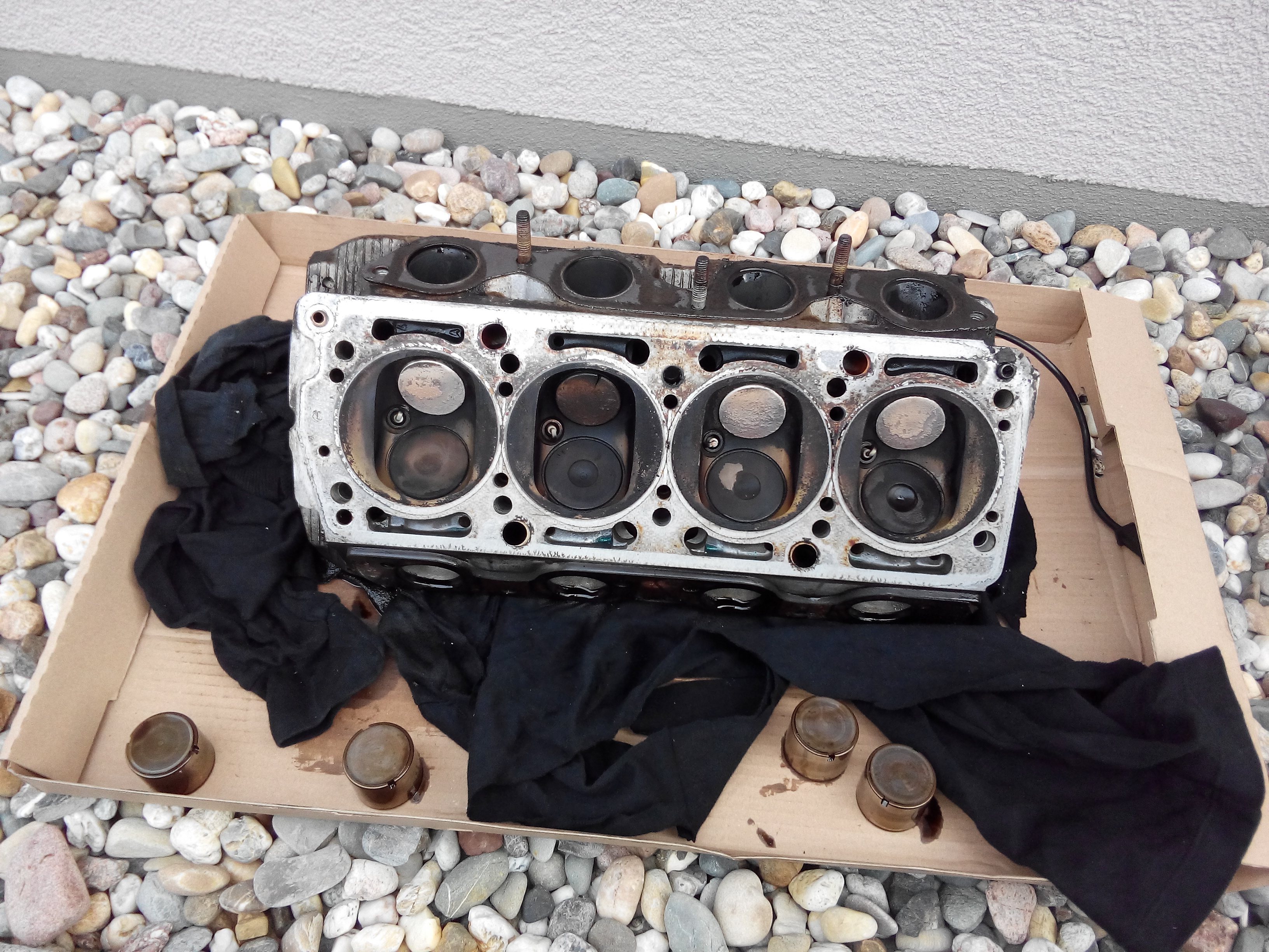 Also vorne wieder alles zerlegt und den Turbo samt Krümmer demontiert, dabei fiel mir auf, dass der Auslasskanal im Zylinderkopf völlig nass war (Benzin), ich drehte den Motor durch und hörte leider die Luft am Auslassventil vorbeizischen - Mahlzeit ![]()