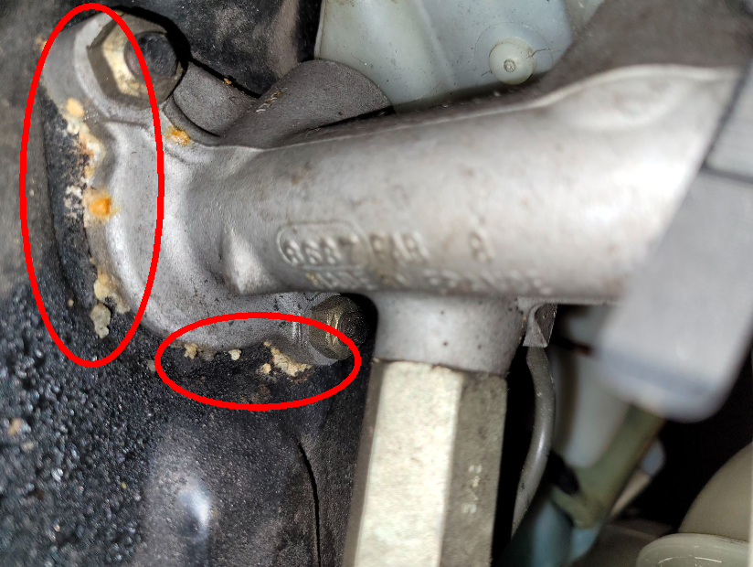 Die im Bild zu senden Verkrustungen deuten auf eine ältere Undichtigkeit an HBZ hin, dabei kann es sich um zersetzte Rückstände von ATE Bremsenpaste handeln. Wenn jedoch größere Mengen Bremsflüssigkeit in den BKV gelangen, dann zersetzen diese die Druckmembrane des BKV und würden aufgrund deren Undichtigkeit der Membrane zu einem spürbaren Bremsleistungsverlust führen; dann müsstest Du schon ordentlich in die Bremse latschen müssen.