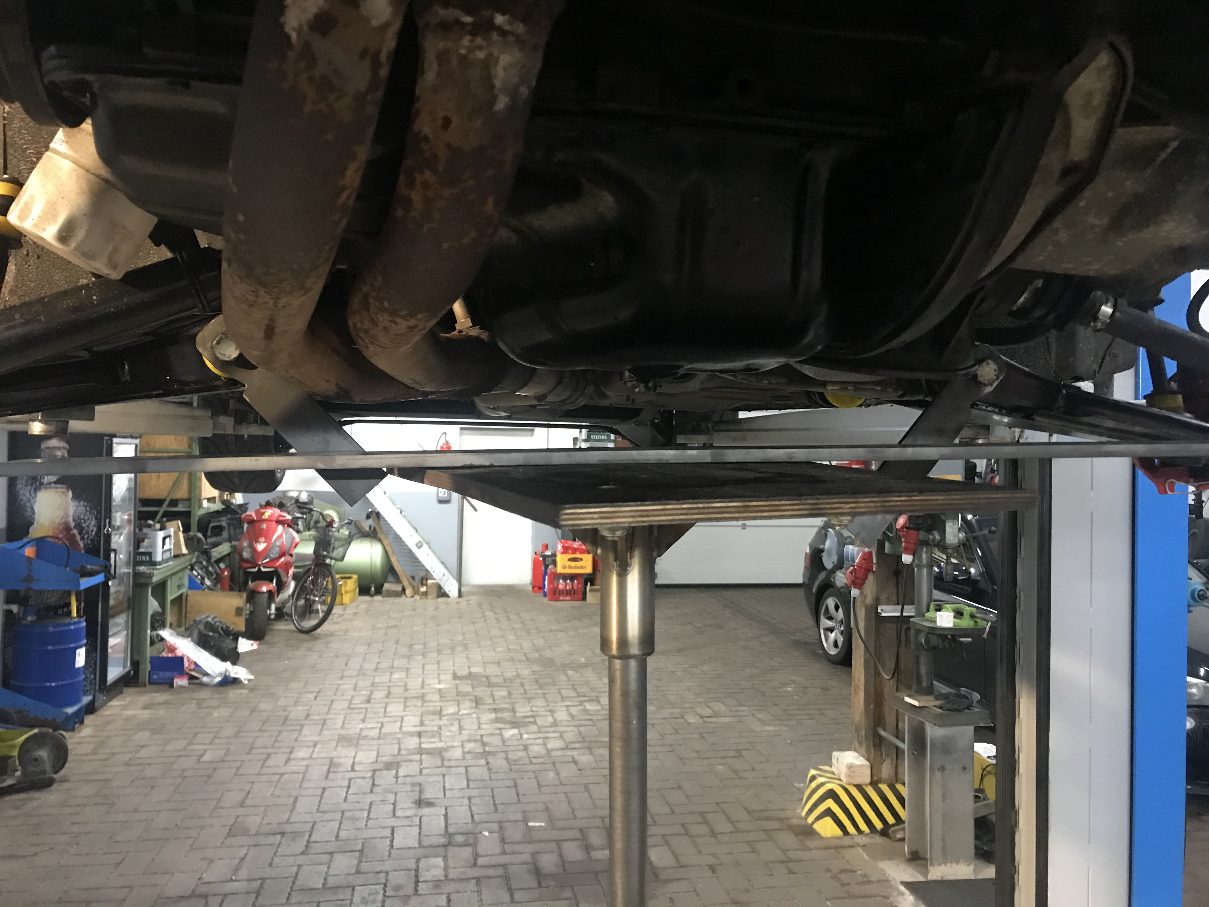 Hatte leider keine Zeit megr um die nach hinten abzustützen aber erstmal so besser als gar keineDurch den besseren hinteren Getriebe Lager, sitzt der Auspuff deutlich höher
