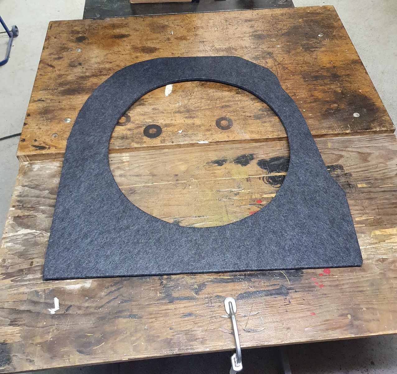 Da kein Deckel o.ä. über der Reserveradmulde vorhanden war, hing der angefertigte Teppich um das Reserverad herum unschön nach unten. Deshalb habe ich noch eine andere Kunststoffplatte passend zur Mulde ausgesägt und mit Filz bezogen. Sie dient nun als Trägerplatte unter dem Teppich.