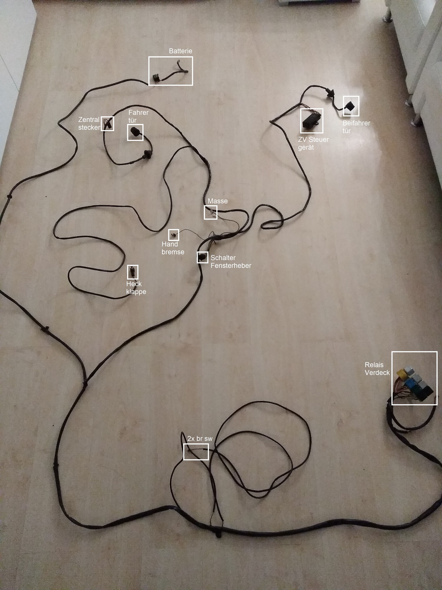 Ich habe mir von einem Schlachtfest den kompletten Kabelbaum für Zentralverriegelung, elektrische Fensterheber und elektrisches Verdeck schicken lassen.