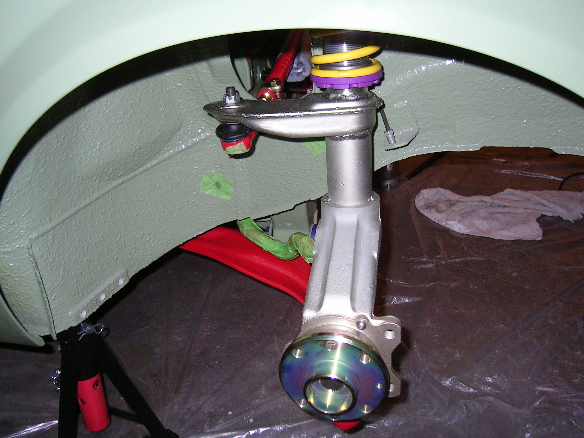 Nein, paßt nicht. Verbaut ist ein KW Gewindefahrwerk fürn D - Kadett - Spurstange von unten montiert (so, wie es beim D original ist). Im komplett ausgefederten Zusand kann ich nicht mehr lenken, weil die Spurstangen am Rahmen angehen. Verbaut ist ein E30 Domlager, was mit der Höhe vom D - Kadett Domlager identisch ist. Ich kann zwar mit Uniball - Domlagern mehr Platz gewinnen, aber ich wollte etwas Gummi zur Dämpfung noch in den Domlagern haben.