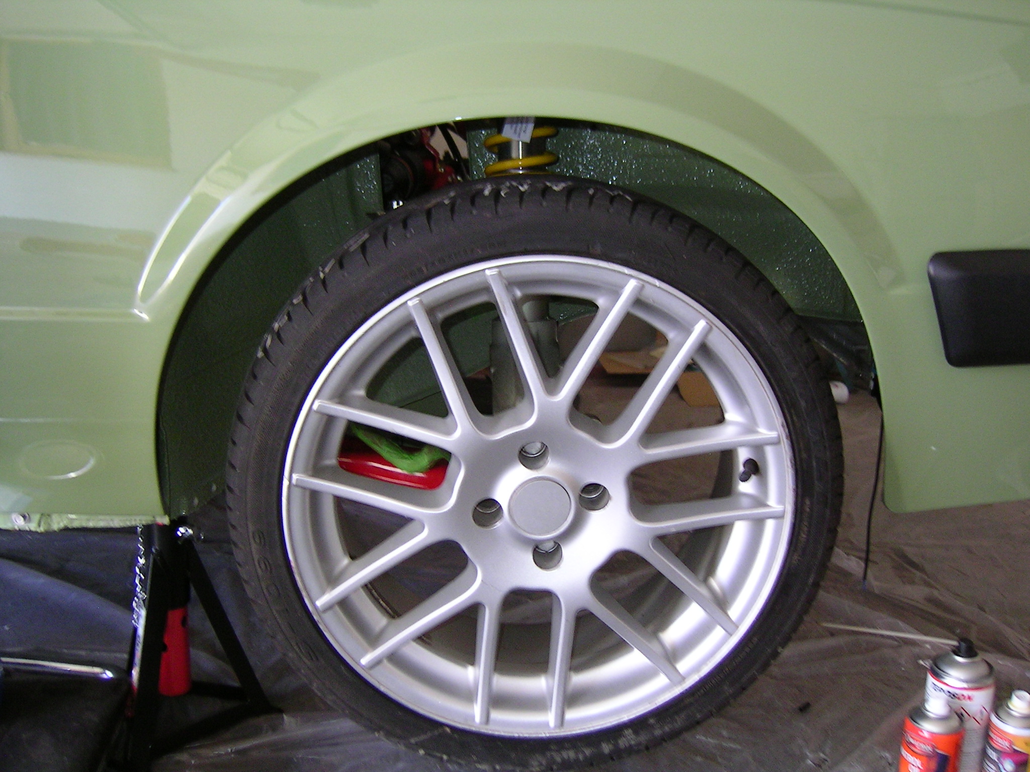 Wo ich mir schon Sorgen gemacht hab, daß das Auto zu tief wird. Theoretisch hab ich ja mit den Uniballdomlagern eine Tieferlegung von 80 - 115 mm. Ausgefedert würde es so ausschauen (Reifen - Radlauf 6 cm):