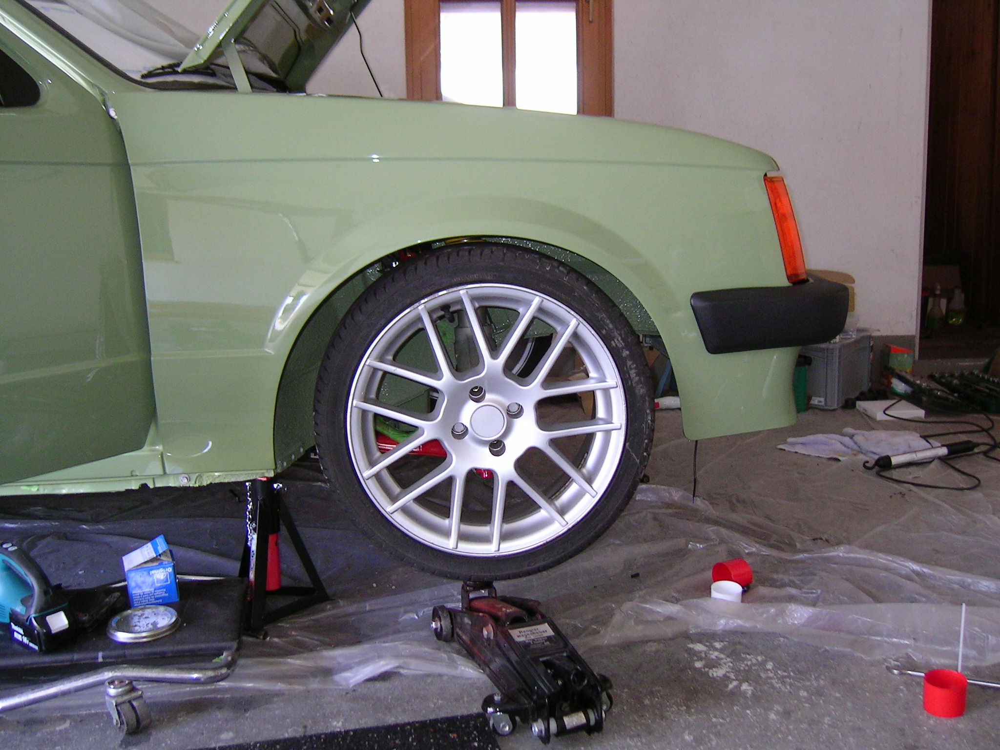 5 mm Abstand wäre ja OK. Das sind aber nur Testräder. Die Felden sind 7,5x17 ET30. Die Felgen, die rauf sollen sind 7,5x17 ET35. Also liegt der Reifen an. 205 Reifen sollen bleiben. Falls sich einer wundert, da sind keine Bremsscheiben dazwischen - stimmt, aber 5 mm Spurplatten. Irgendwas ist mit dem KW Gewindefahrwerk fürn D - Kadett seltsam. Ich glaub schon fast, daß was mit den Lenkhebeln schief gegangen ist. Ich wird dann demnächst ein E - Kadett Gewindefahrwerk ordern.
