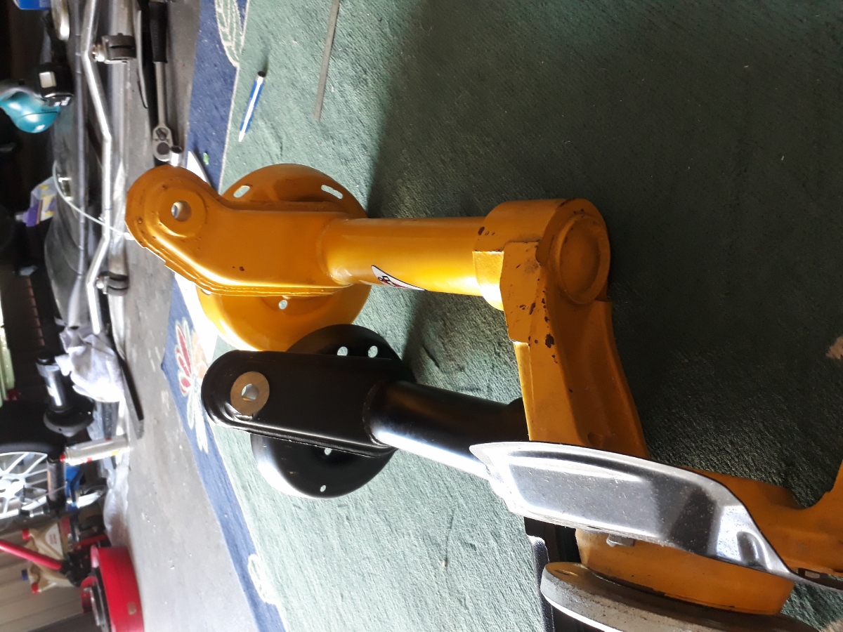 #15 Gelb ist D-Kadett Bigblock (grosses Radlager), schwarz E-Kadett. Der Lenkhebel ist nicht verdreht angeschweißt, die Form ist für ein Gewindefahrwerk nicht passend. Normalerweise ist der Lenkhebel beim originalen Federbein überm Rad - da ist es dann egal, daß der so seltsam geformt ist. Warum der Hebel so einen Knick hat, weiß der Geier. Ich bestell mir jetzt ein E-Kadett Gewindefahrwerk.