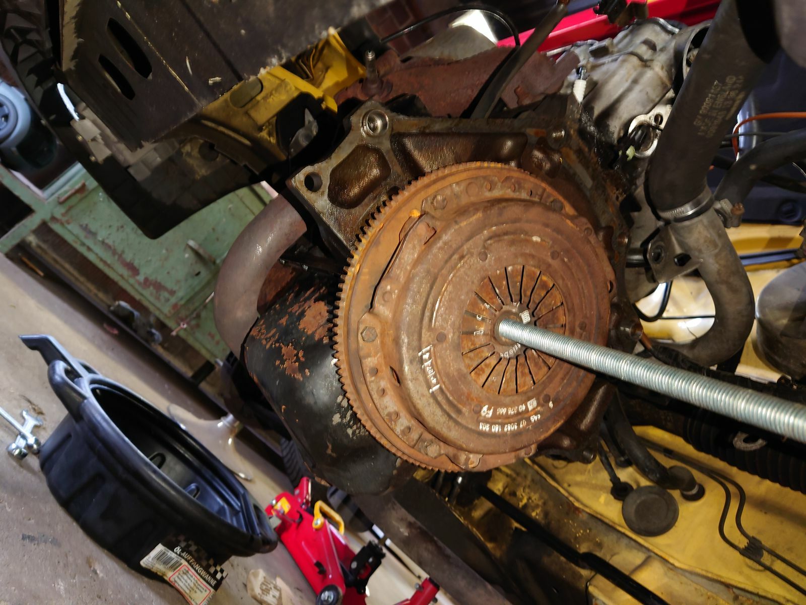 Heute habe ich das Getriebe schon rausgeworfen und die Starter-Scheibe gegen einen Schwungscheibe getauscht und die Kupplung verbaut.