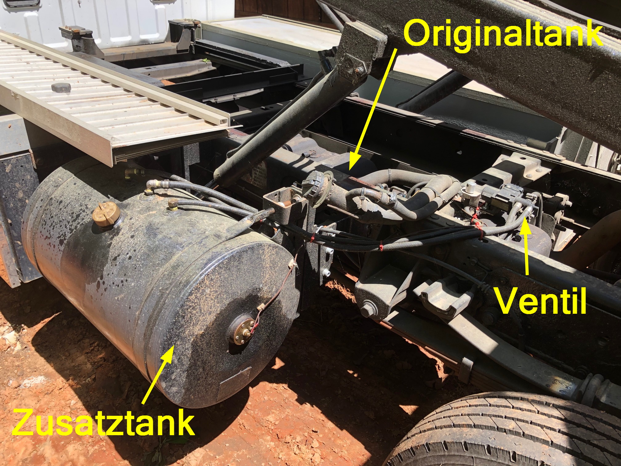 Ich habe in meinem Truck einen Zusatztank eingebaut, 40 Gallonen (150 Liter) zusaetzlich zum Originaltank (17 Gallonen, 65 Liter). Die sind beide permanent ueber ein Zwischenventil angeschlossen, mit einem Schalter in der Kabine. Das Ventil hat Anschluesse fuer Vorlauf und Ruecklauf fuer die zwei Tanks, und die entsprechenden Vor/Ruecklauf Anschluesse zur Benzinpumpe und dem Motor (kann also auch fuer Einspritzmotoren verwendet werden). Der Clou ist dass das Ventil auch ein Relais mit drin hat dass die beiden Fuellstandsgeber automatisch mit umschaltet, und damit meine Benzinanzeige in der Kabine immer den Stand des "aktiven" Tanks anzeigt. Der Schalter erlaubt mir waehrend der Fahrt zwischen den beiden Tanks hin-und-herzuschalten, komplett ohne Unterbrechung.