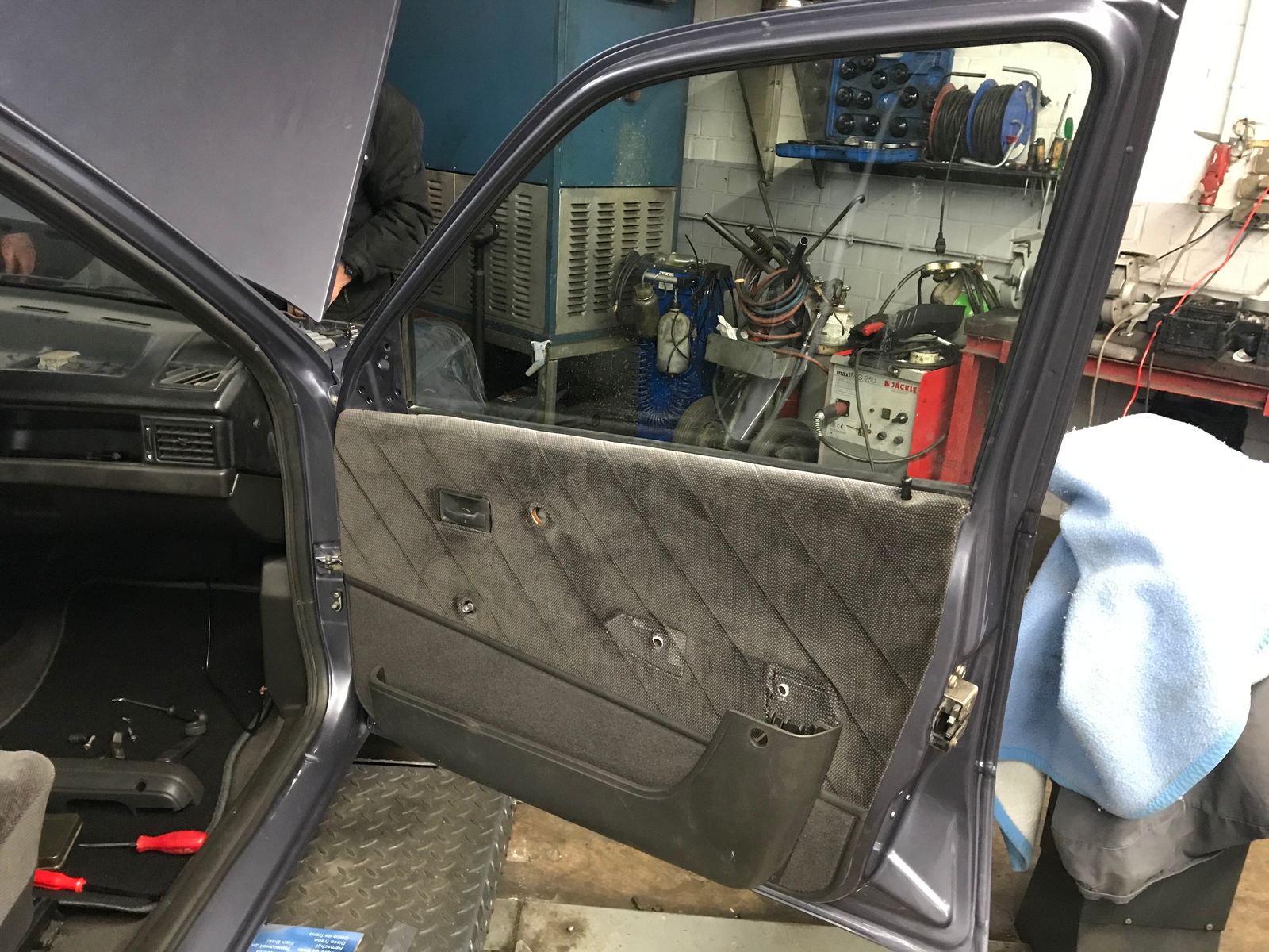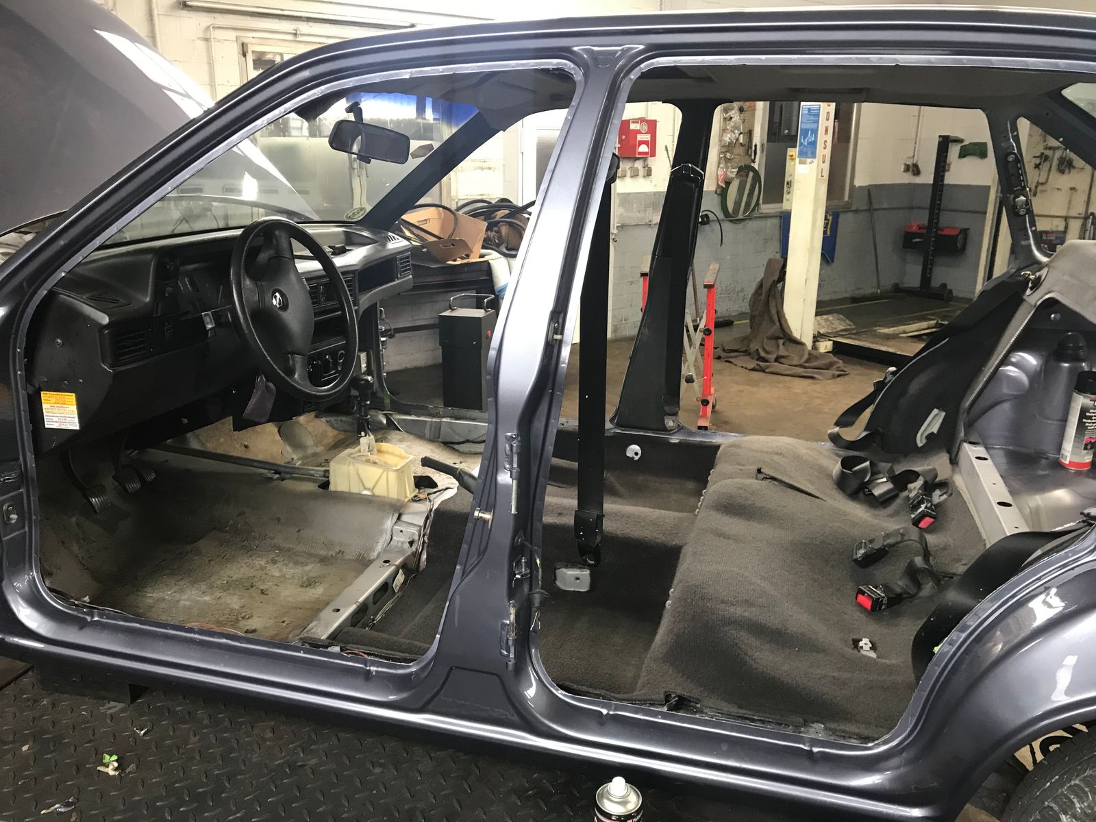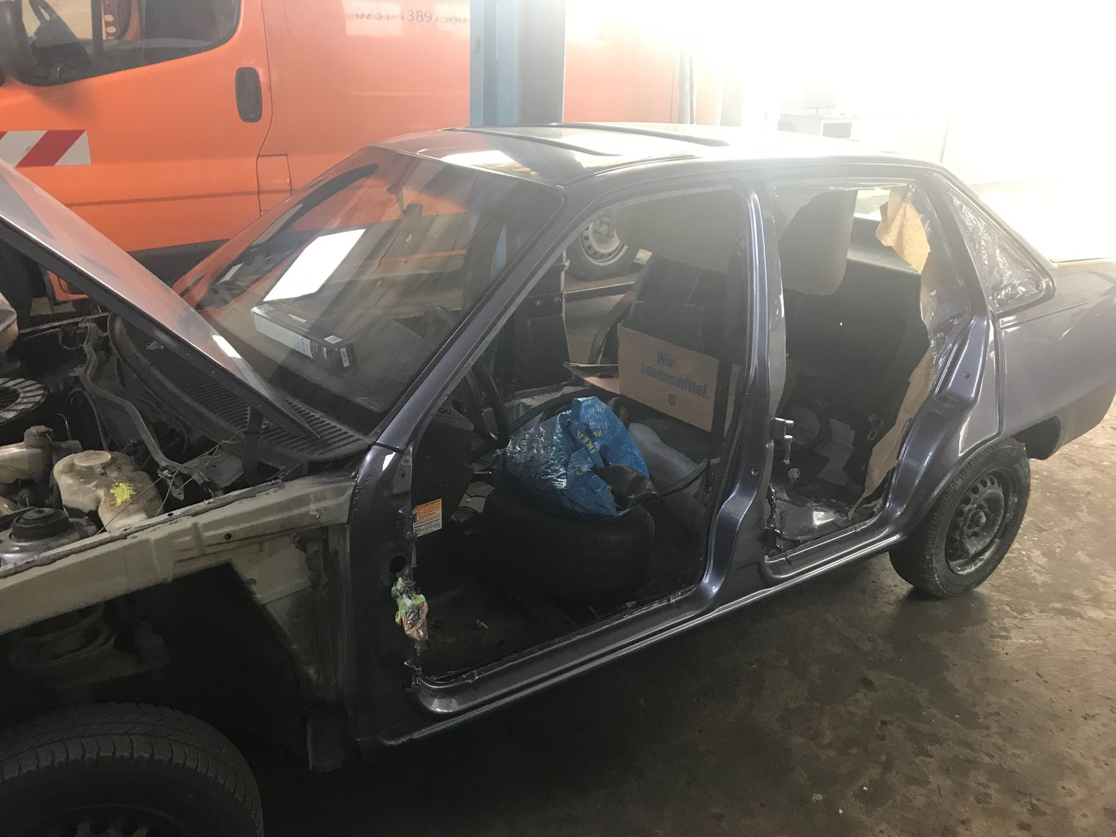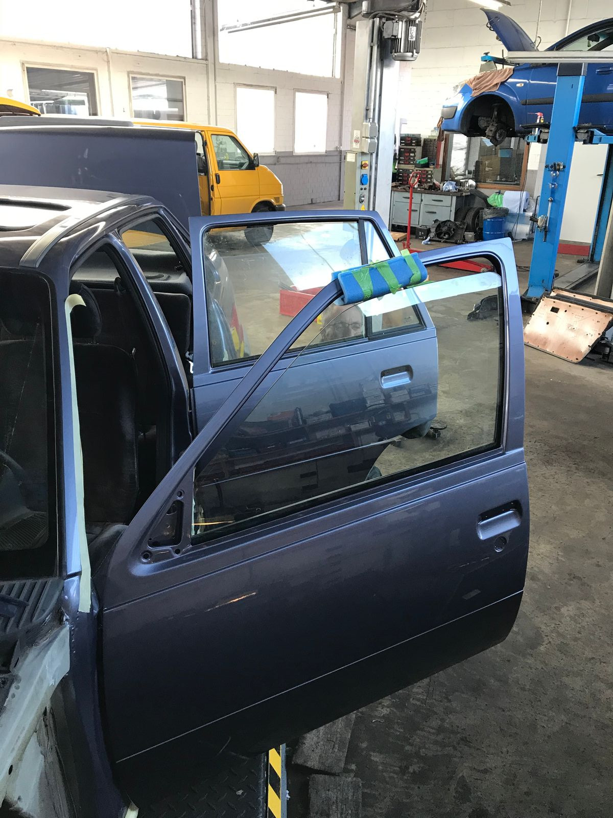 Der Kadett wurde dann Montags vom Altmeister zum Lackierer gebracht. Ich hatte dort mit dem Inhaber gesprochen, ob es okay sei, wenn ich zwischendurch für 2-5 Fotos mal reinschaue. Durfte ich - aber klare Ansage vom Chef: Wir sind hier gläsern. Jeder Kunde darf herkommen und sich ansehen, was wir hier machen. Aber bitte nicht stundenlang, bitte nicht die Mitarbeiter vollquasseln oder mit Fragen löchern, sonst schaffen wir unsere arbeit nicht. Wir sind täglich von 8-17 Uhr hier.
