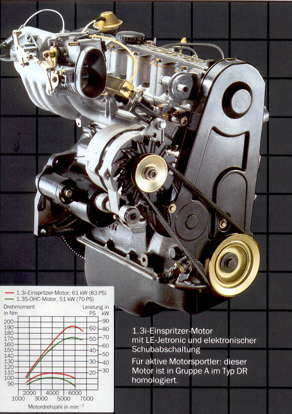 #5 Das ist ein normaler 13Ei Motor. Basierend auf einem Serienmässigen 13S/SB von Opel, daran wird das Irmschersaugrohr geschraubt mit einer leicht abgeänderten LE-Jetronic Einspritzanlage vom Ascona C SR/E bzw. Kadett D GT/E 18E. Damit steigt die Leistung von 70 (beim SB) und 75 (beim S) auf 83PS.