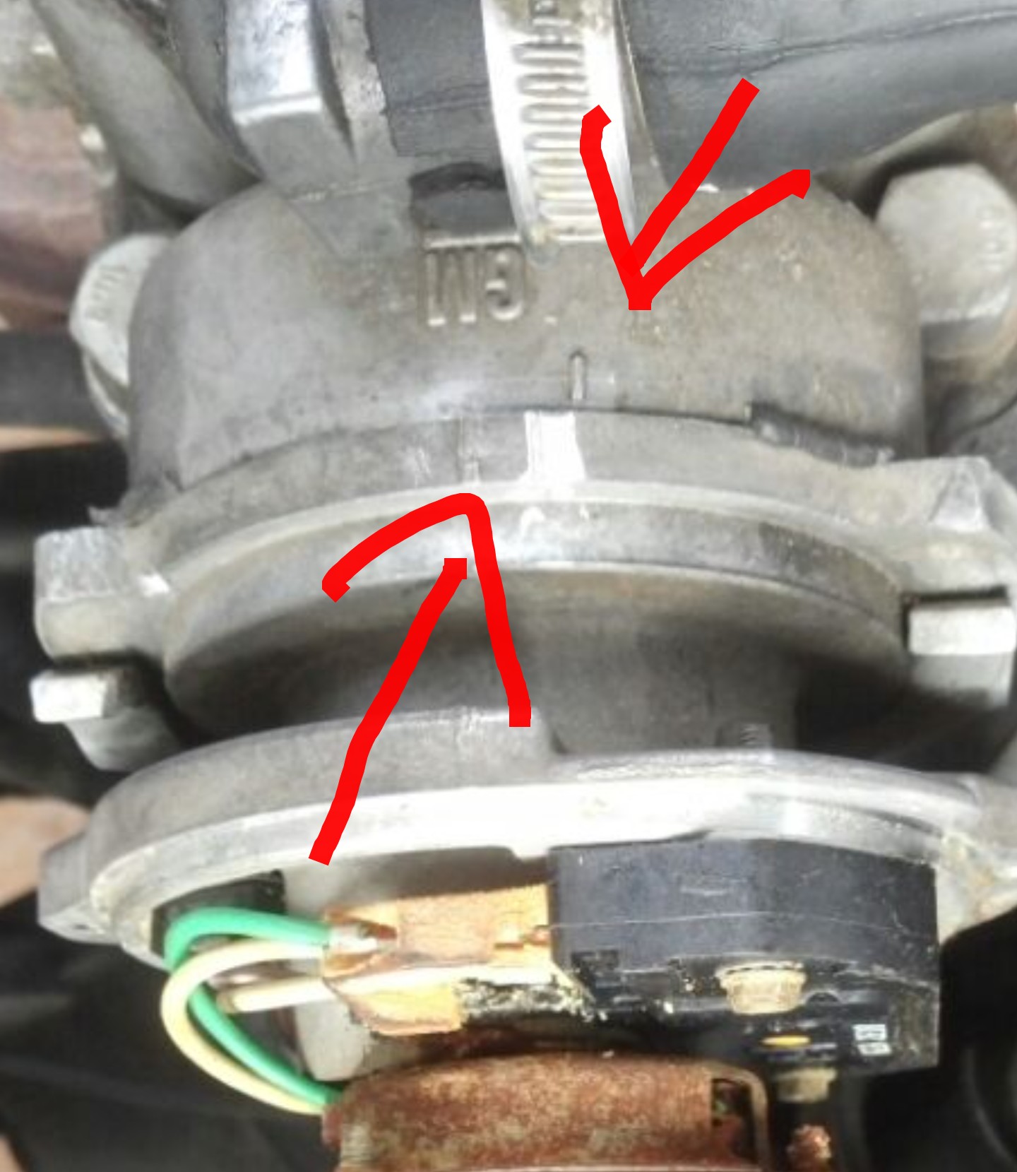 Oben auf dem Rand des Verteilers, welcher am Nockenwellegehäuse anliegt, ist eine Kerbe (sehr verwaschen und undeutlich) die mit der gleichen Kerbe am Gehäuse fluchten soll. Das ist die Verteiler-Grundeinstellung.