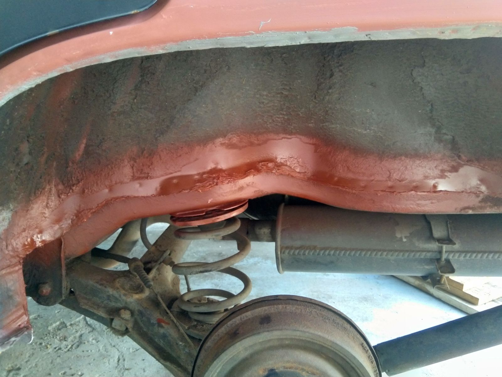 Habe aber an meinem auch weiter gemacht im Radhaus. Links bin ich fürs erste fertig, hab Grundiert, Kanten abgedichtet, nochmal grundiert und dann Unterbodenschutz drüber. Um die Stoßdämpfer Aufnahme oben habe ich mich auch gekümmert.