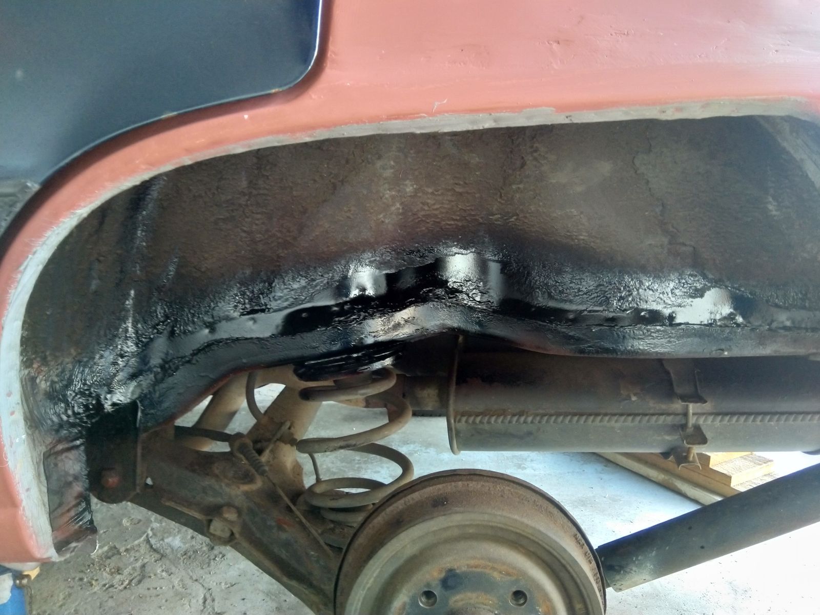 Habe aber an meinem auch weiter gemacht im Radhaus. Links bin ich fürs erste fertig, hab Grundiert, Kanten abgedichtet, nochmal grundiert und dann Unterbodenschutz drüber. Um die Stoßdämpfer Aufnahme oben habe ich mich auch gekümmert.