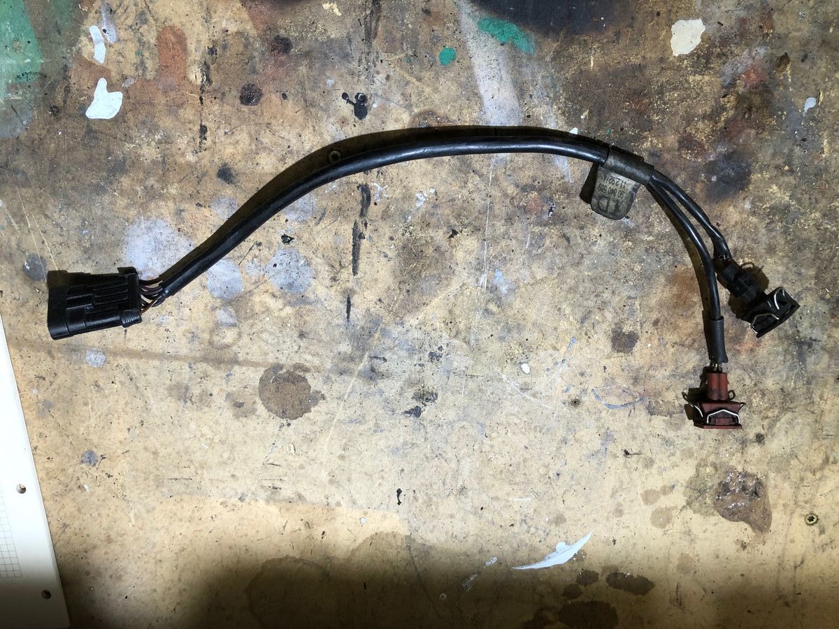 Suche das gezeigte Kabel, mit dem 5-poligen Kontakt zum Motorkabelbaum, und den Anschluessen zu Leerlaufregler und Klopfsensor. Soweit ich an dem vorhandenen Kabel noch erkennen kann, sollte die Teilenummer 90340508 (oder -509?) sein.