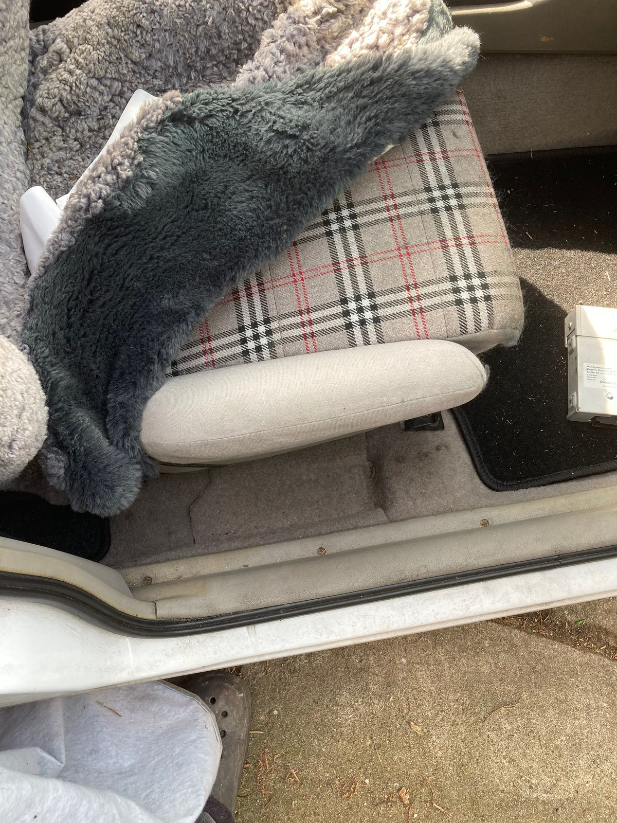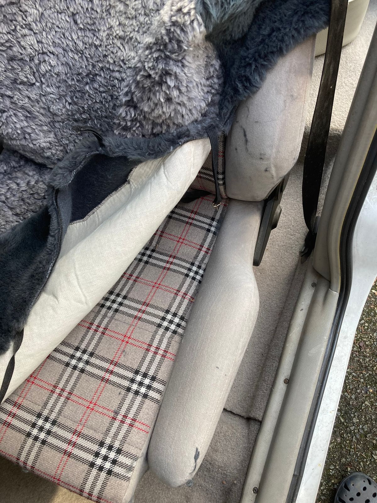 vielleicht helfen ja die Bilder, Der Beifahrersitz war mit einem Fell geschützt, genau wie der Fahrersitz. Der Fahrersitz war lange Zeit ausgebaut, wegen eines Recaro Sitzes mit Sitzheizung. Der Kadett ist noch komplett, nur ein paar " Stöpsel " für die Schrauben in den Armlehnen fehlen.