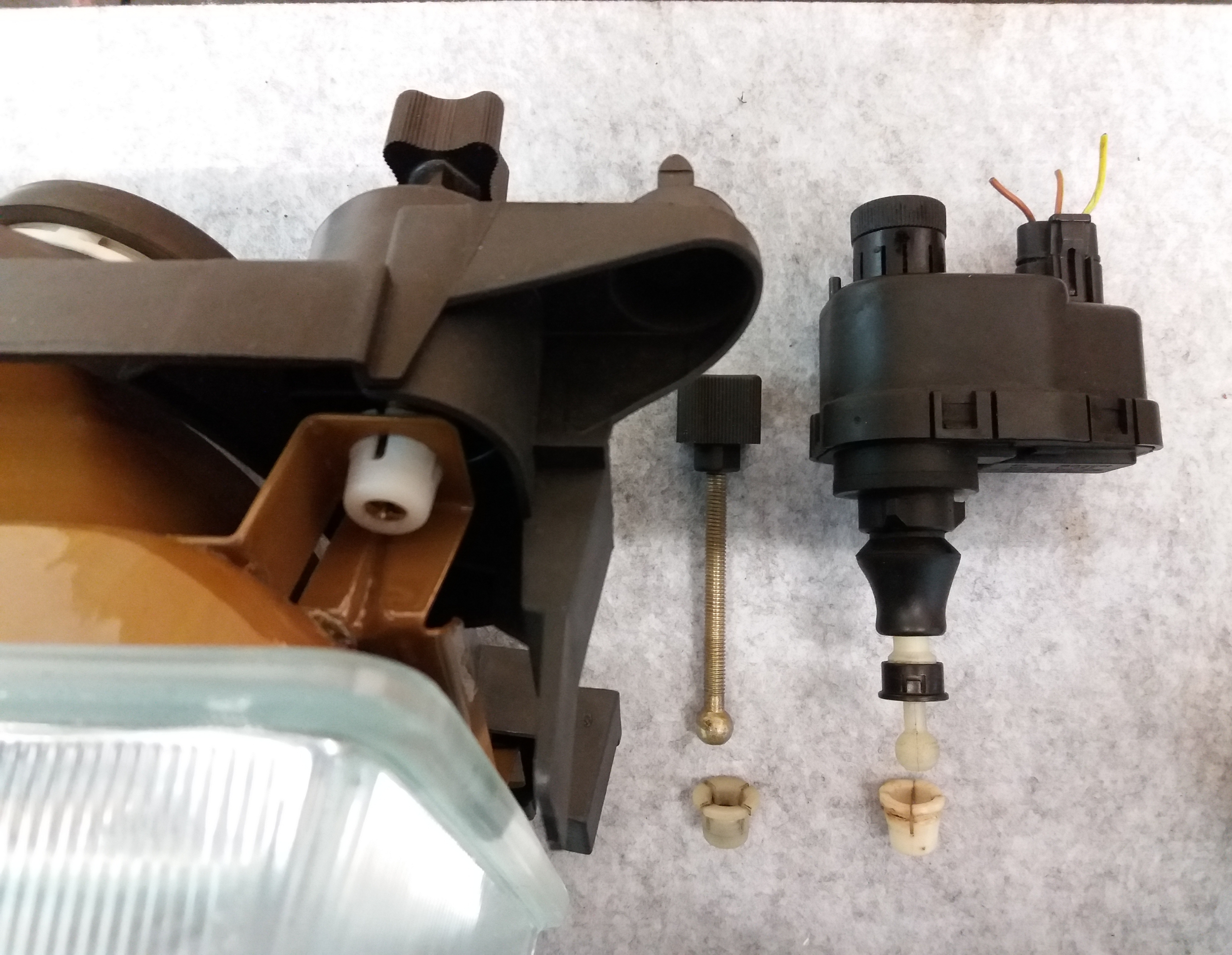 #4 Der Stellmotor ist mit einem Kugelkopf am Ende des Kolbenbens in eine Kunststoffhülse am unterem Scheinwerfer gesteckt. Diese Steckverbindung musstest Du auch sehen, da der Scheinwerfer ausgebaut ist.