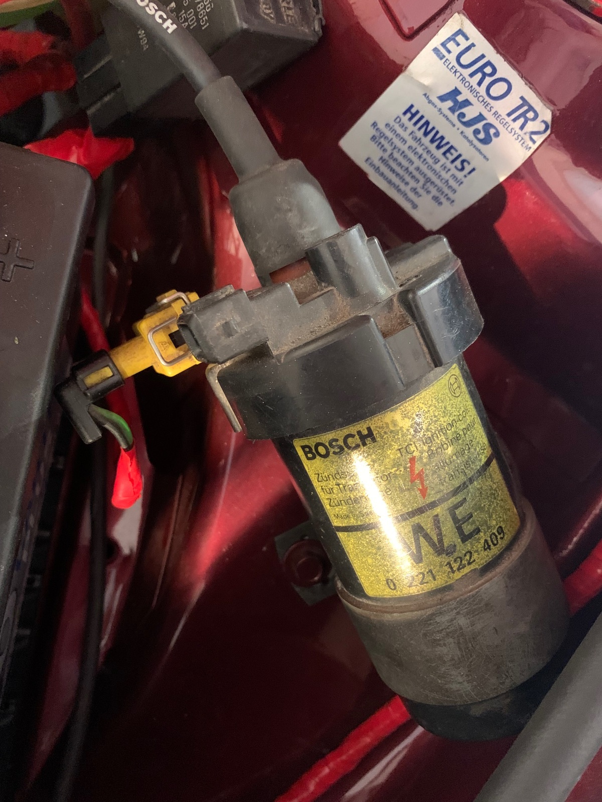 Keiner der beiden Stecker vom elektronischen Kaltlaufregler gehört an die Zündspule. Der eine gehört an den Kühlmittelsensor im Kühlwasserkreislauf und der andere an das Zusatzluftventil für die Leerlaufanhebung.