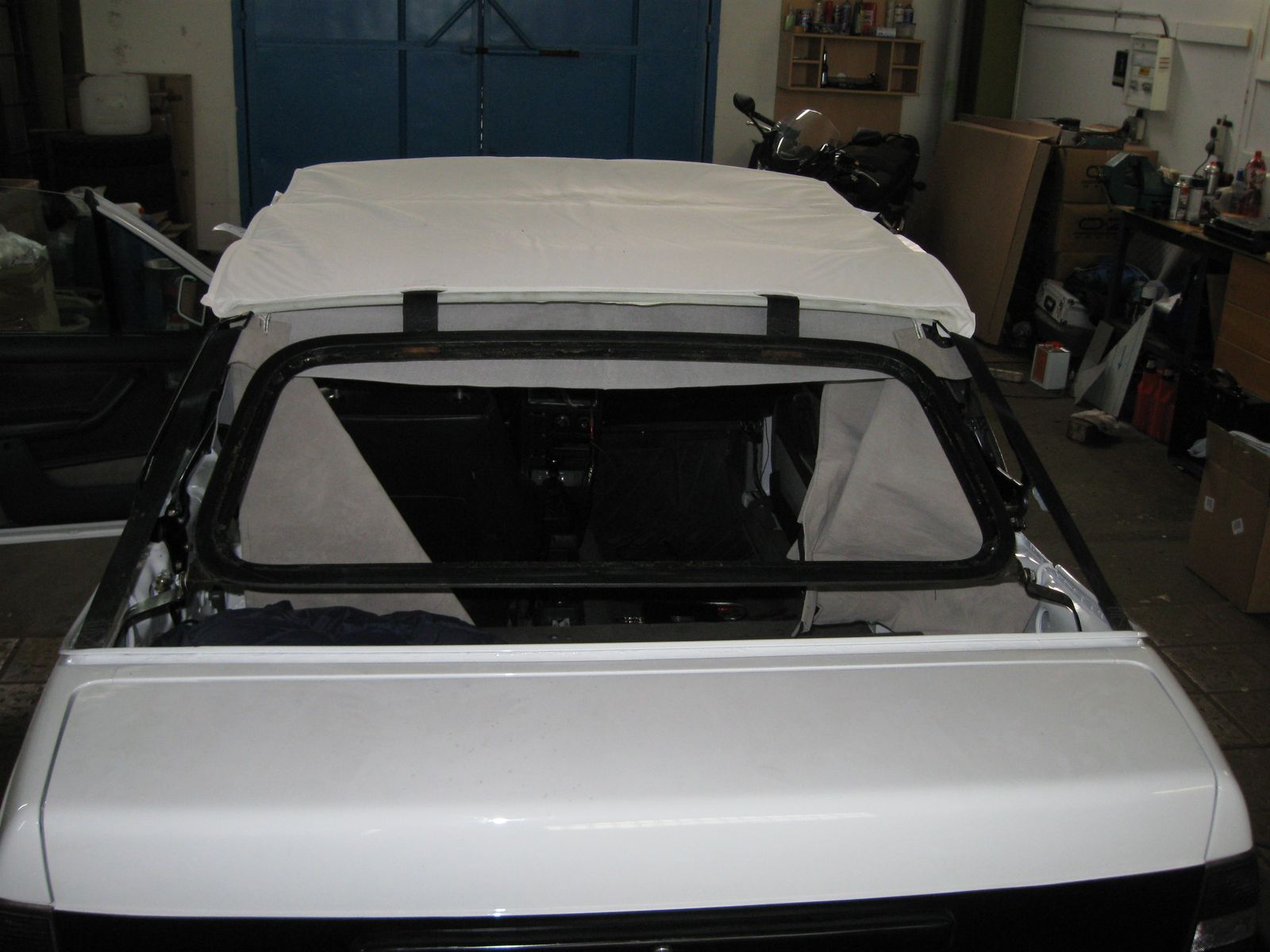 Auch das "Herunterziehen" an den Seiten hinten außen ist wichtig. Wenn du das zu lasch machst, wird das Verdeck an den hinteren Seitenscheiben nicht dicht und wirft Falten im Stoff.