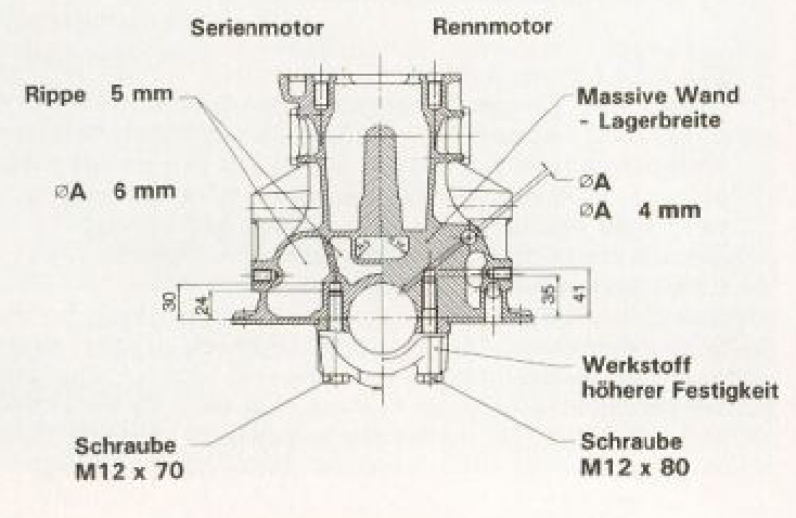 - Änderung des Serienblocks aus Grauguss für eine höhere Steifigkeit im Bereich der Lagerböcke durch Vollmaterial, das diese nicht ausreisen (Serie 5mm starke Rippen-Wandung)
