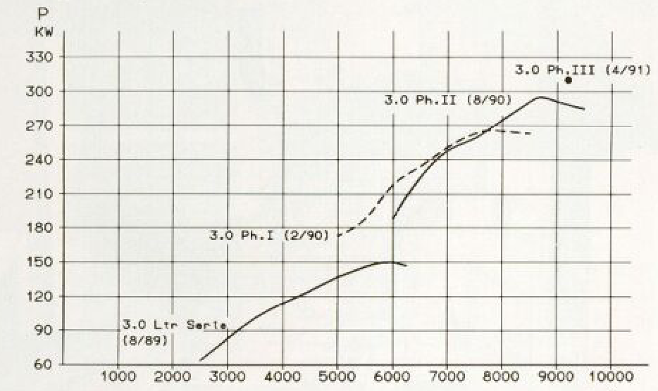 Nach den verschiedenen Ausbaustufen mit anfänglich 265kw / 360PS bei 8000U/min erlangte der Omega-Rennmotor in seiner letzten Ausbaustufe im Jahre 1993/94 eine Leistung von 404kw / 550PS bei 9800 U/min, die ihn auf eine Höchstgeschwindigkeit mit der längsten Übersetzung auf 330km/h beschleunigte.