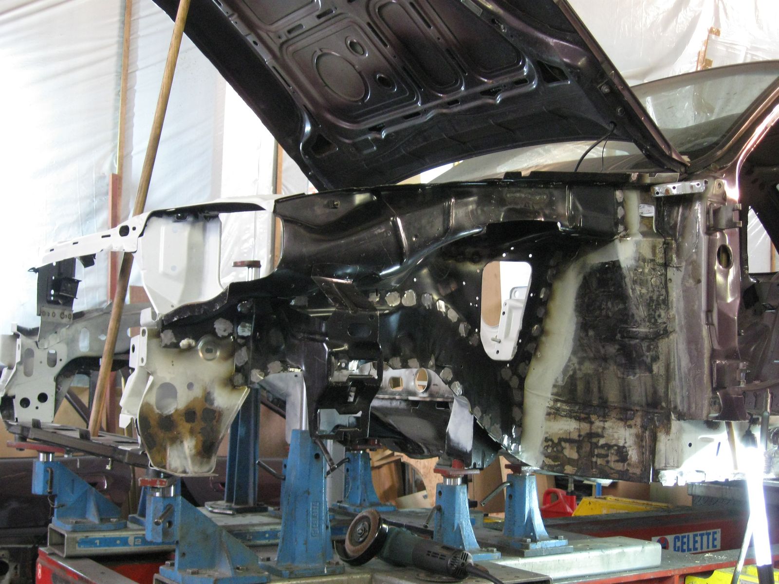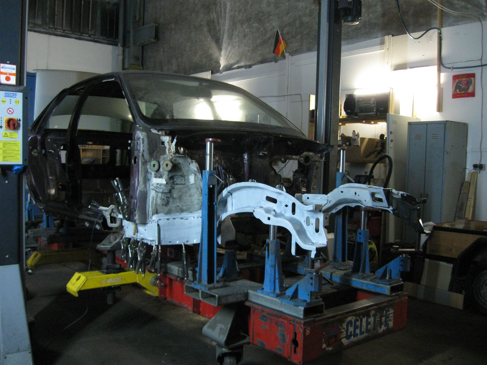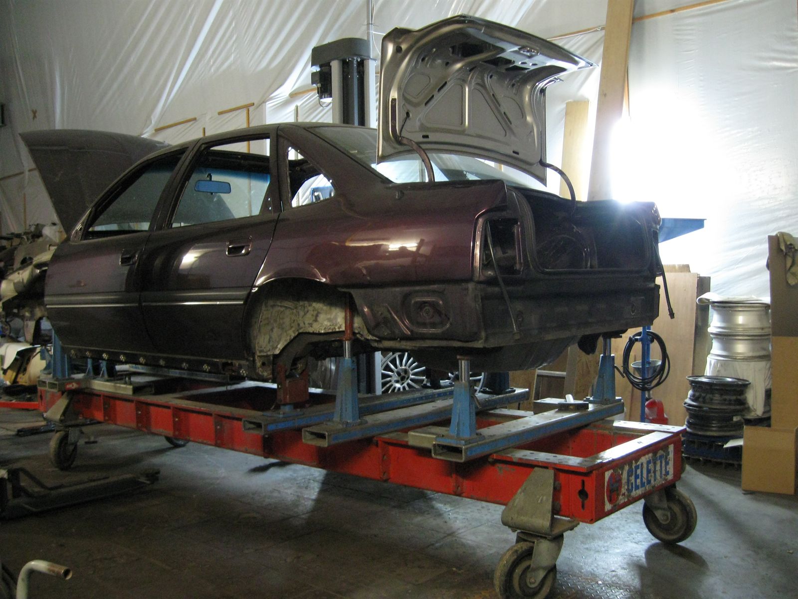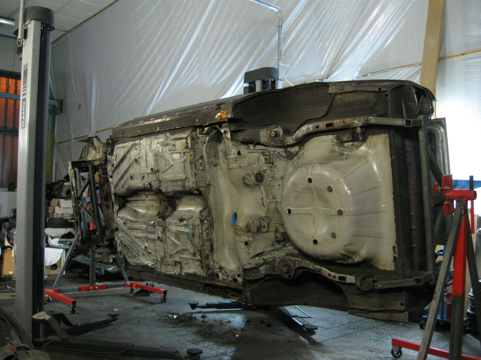 Am Ende war nur noch die nackte Karosse übrig. Damit ich vernünftig arbeiten konnte habe ich mir ein Drehgestell gebaut....