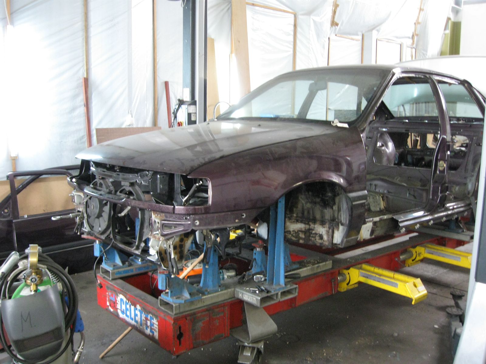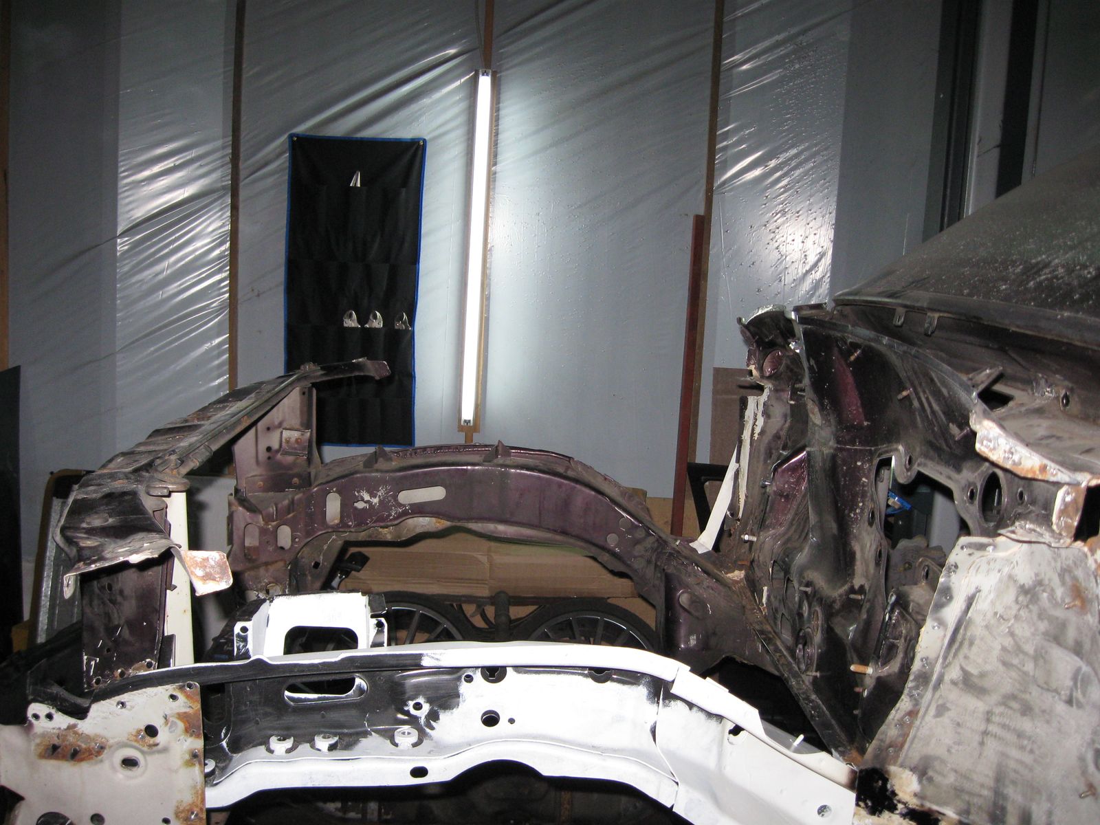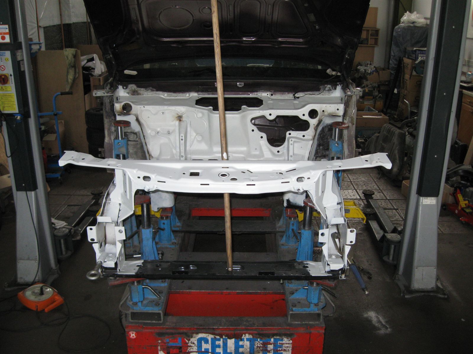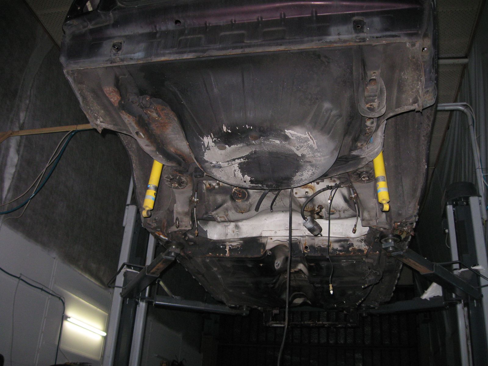 Am Ende war nur noch die nackte Karosse übrig. Damit ich vernünftig arbeiten konnte habe ich mir ein Drehgestell gebaut....