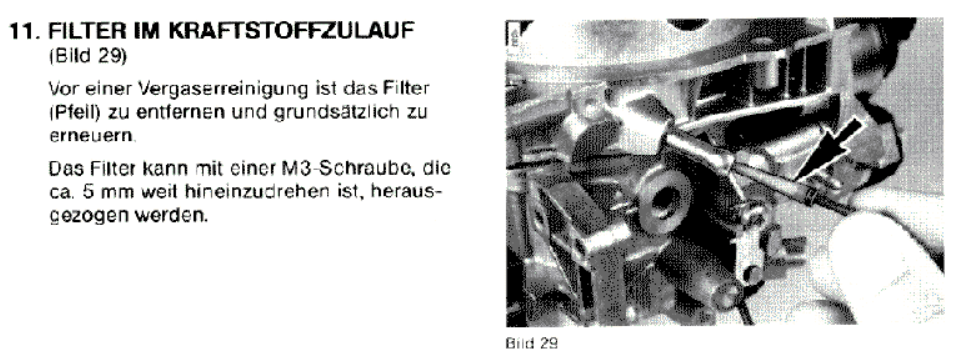 Der werkseitig nicht vorhandene Kraftstofffilter sitzt bei Deinem Vergaser an dieser Stelle und sieht wie folgt aus. Den würde ich an Deiner Stelle mal ausbauen und mit Benzin oder Verdünnung auswaschen.