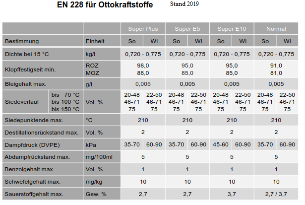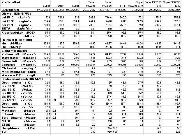 Die heutigen Ottokraftstoffe sind genormt nach EN 228. Wie in den Tabellen zu sehen ist hat sich seit 1987 nichts Weltbewegendes an den Vorgaben geändert. Ja, der Benzol- und Schwefelgehalt sind verringert worden. Das hat aber kaum Einfluss auf den Verbrauch. Der zulässige Sauerstoffgehalt ist hingegen erhöht worden, was wiederum mit der, seit 2009, möglichen Beimischung von bis zu 10% Ethanol zu tun hat. Das wiederum hat schon einen gewissen Einfluss auf den Verbrauch---aber--- in Richtung Mehrverbrauch! Durch Zusatz von Ethanol verringert sich der Kohlenstoffgehalt. Kohlenstoff aber macht den größten Teil des Heizwerts aus (Weniger Heizwert mehr Verbrauch und umgekehrt…). Ich habe noch eine kleine Auswahl an Kraftstoffanalysen angehängt. Damit können die Vorgaben mit der Wirklichkeit verglichen werden.