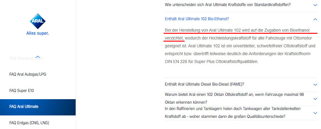 Aral soll wohl der letzte Hersteller sein, der auf die Beimengung von Ethanol verzichtet und dies auch offen kommuniziert; aber wie lange noch, wenn die Kontrahenten da ihrerseits ohne Scheu dies nicht mehr ausschließen.