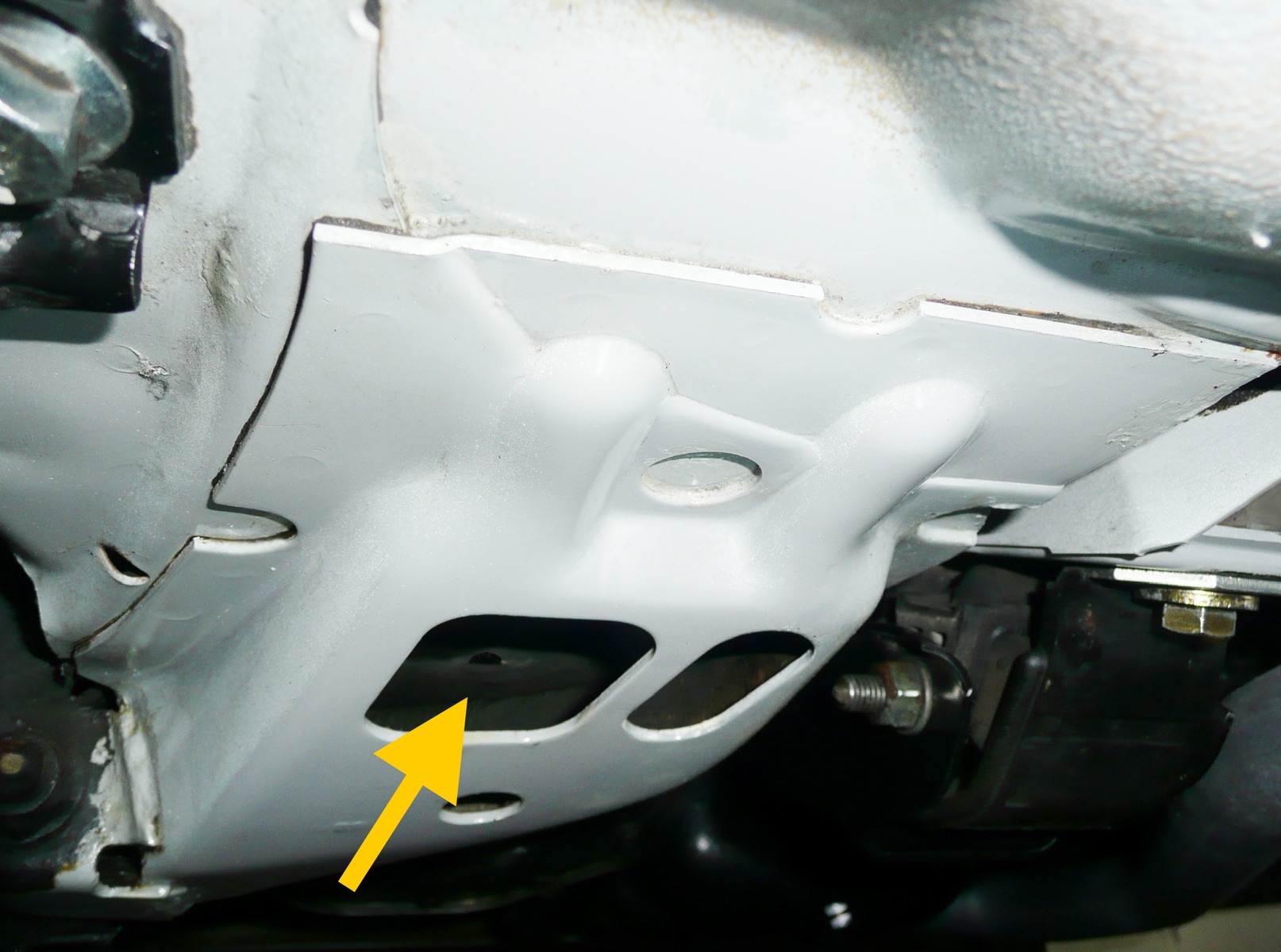 Also solltest Du auf diese typische Roststelle besonders achten. Auf die Schweißnähte beim Blech und auf den Ablauf (mit Pfeil gekennzeichnet) .