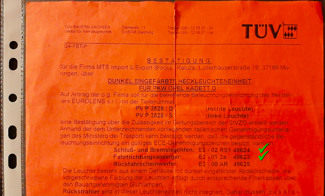Gutachten MTS schwarze Rückleuchten Kadett D Seite 1 & 2