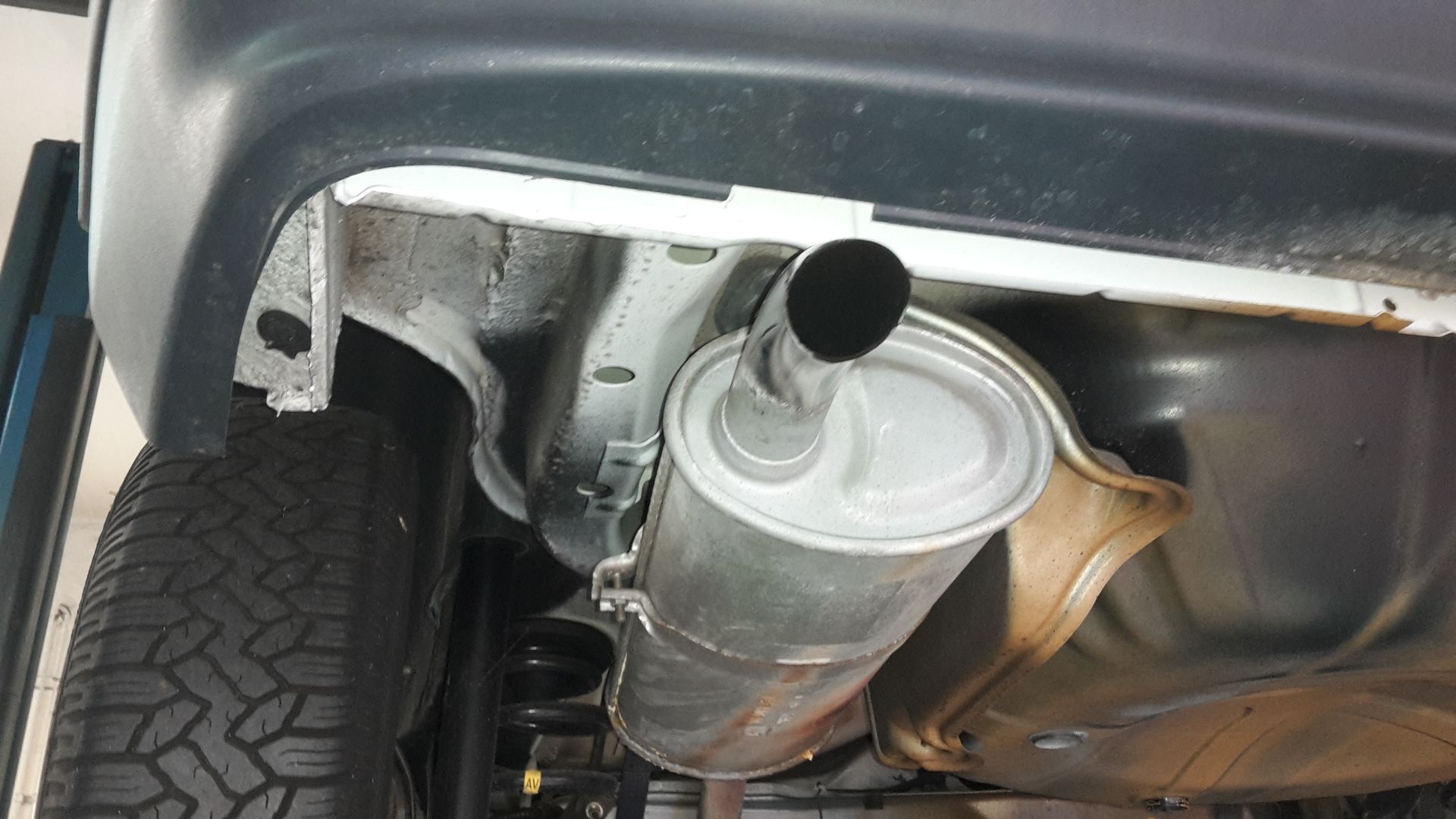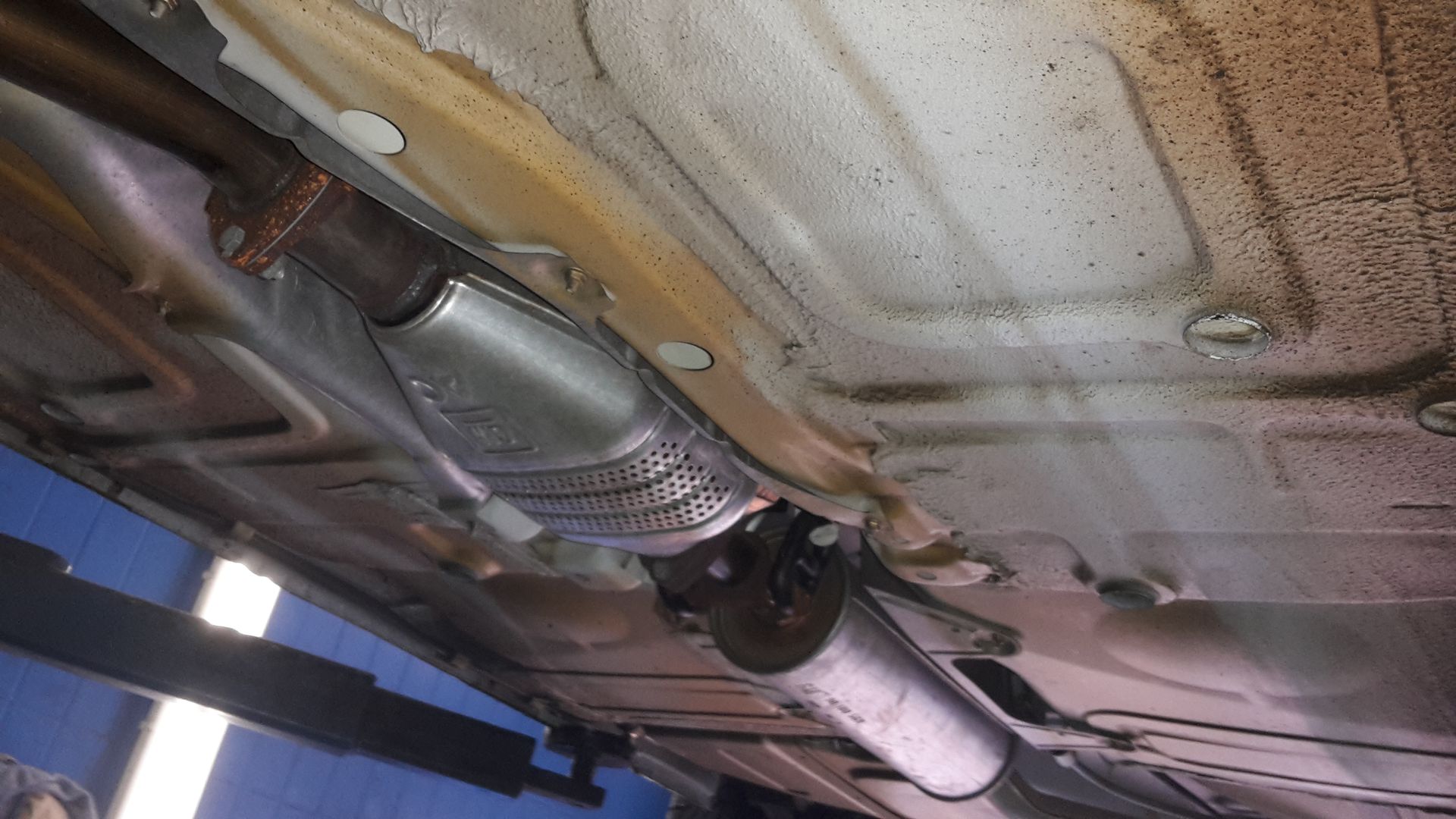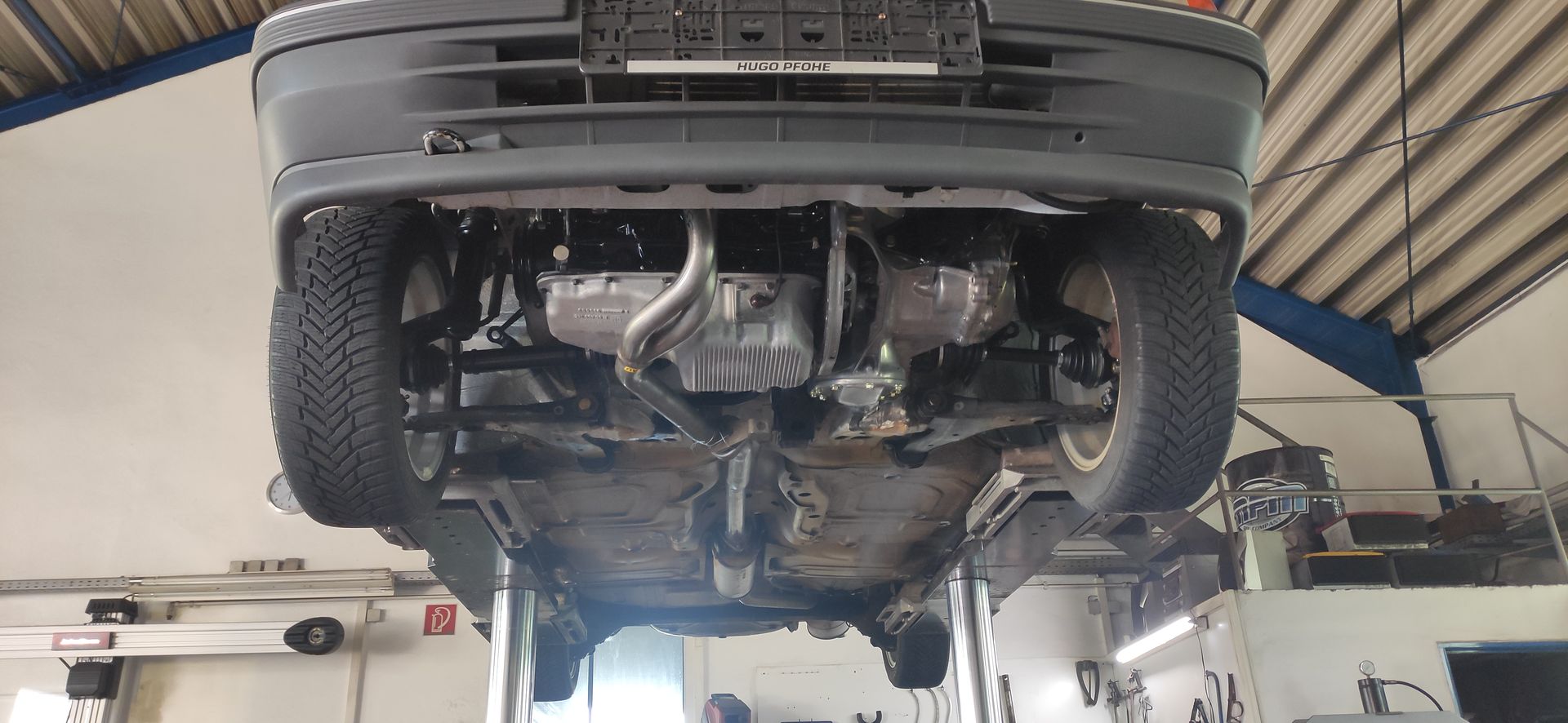 Dann wollte ich vorübergehend das Kat-Ersatzrohr verwenden, bis der richtige Auspuff mit Einschweißkat drunter kommt. Passte natürlich vorne gar nix, jetzt hängt das Rohr provisorisch dran.