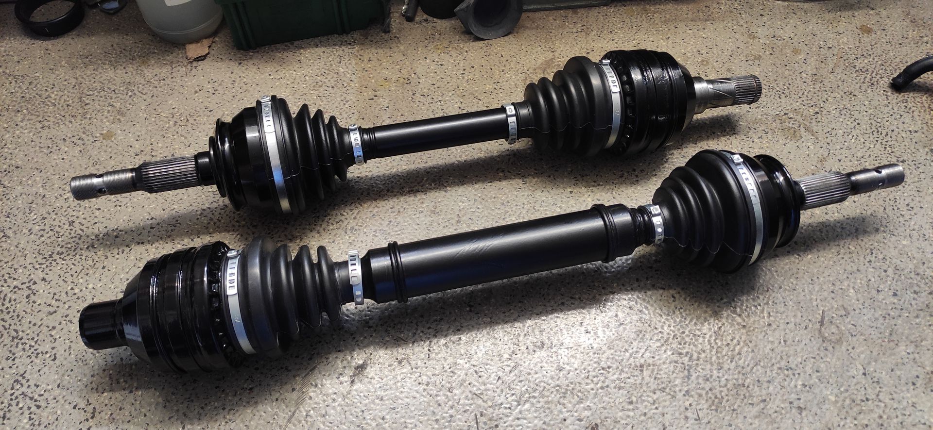Die Antriebswellen sind fertig gestellt. Äußere Gelenke neu, innen gebraucht aus eigenem Bestand. Da ich die geteilte Welle aus dem Astra/Vectra/Calibra fahren werde, habe ich den Einstich an beiden Wellen beidseitig nach innen versetzen lassen (es sind auf dem Foto also 4 Einstiche pro Welle zu sehen). Somit komme ich auf die Länge der Kadett Antriebswellen.