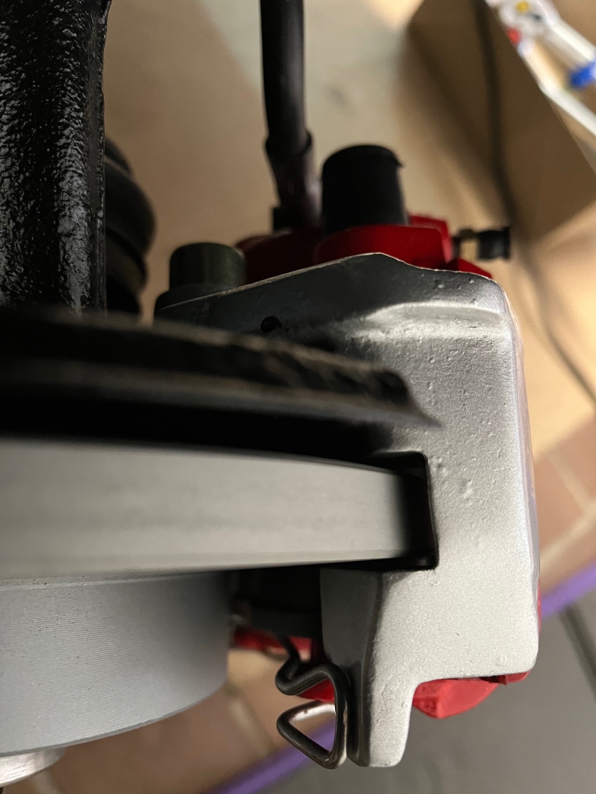 Ich habe bei meiner „kleinen“ 12.8 / 236er-Scheibe nachgeschaut, hier hat der Halter reichlich Platz zur Bremsscheibe. So sollte es bei der großen Bremse von den Abständen auch sein.