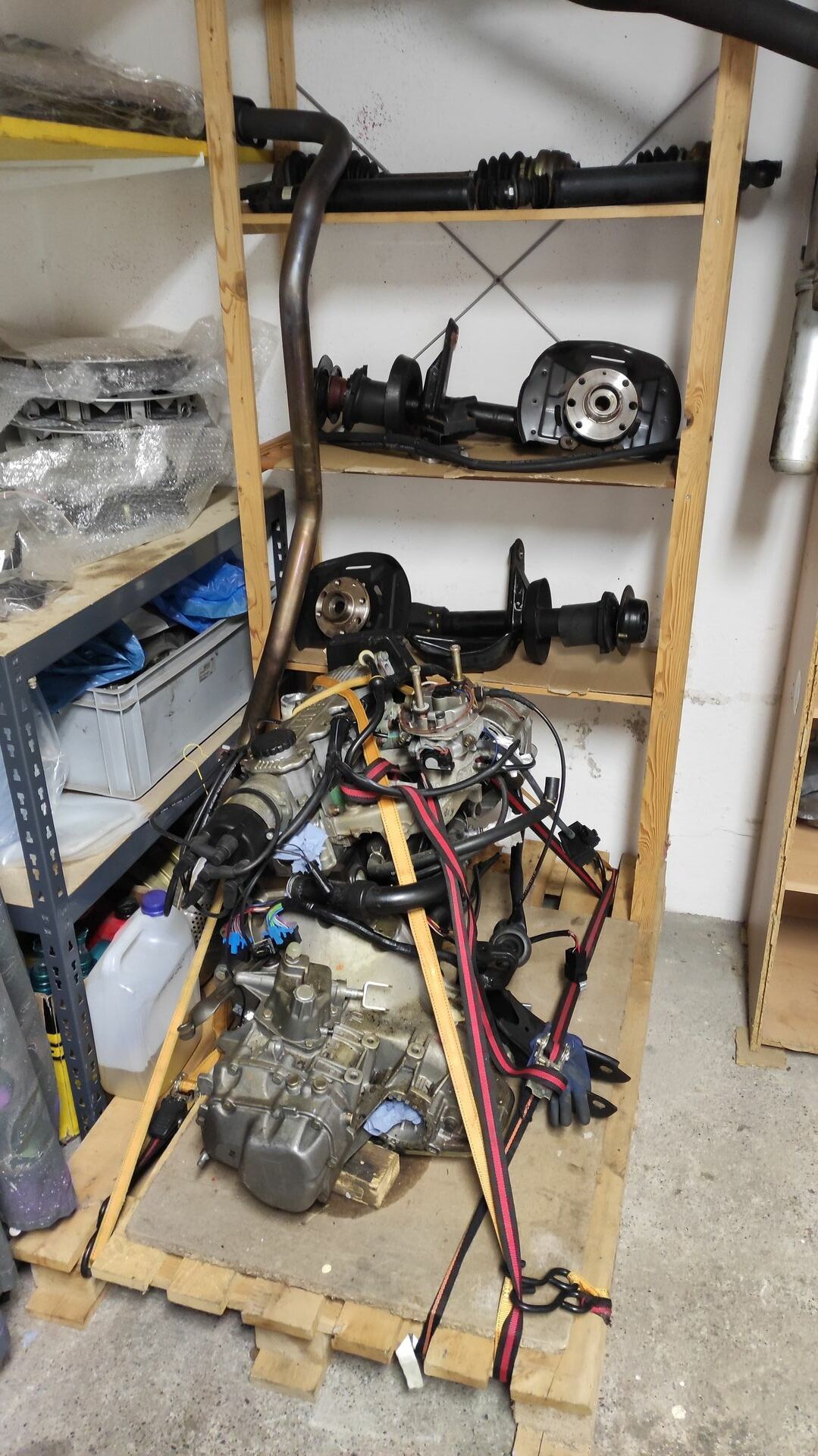 Es geht um Motor, Getriebe, Federbeine, Dämpfer, Auspuff mit Kat , Räder, Radzierblenden, Ansaugkasten und andere Kleinteile.